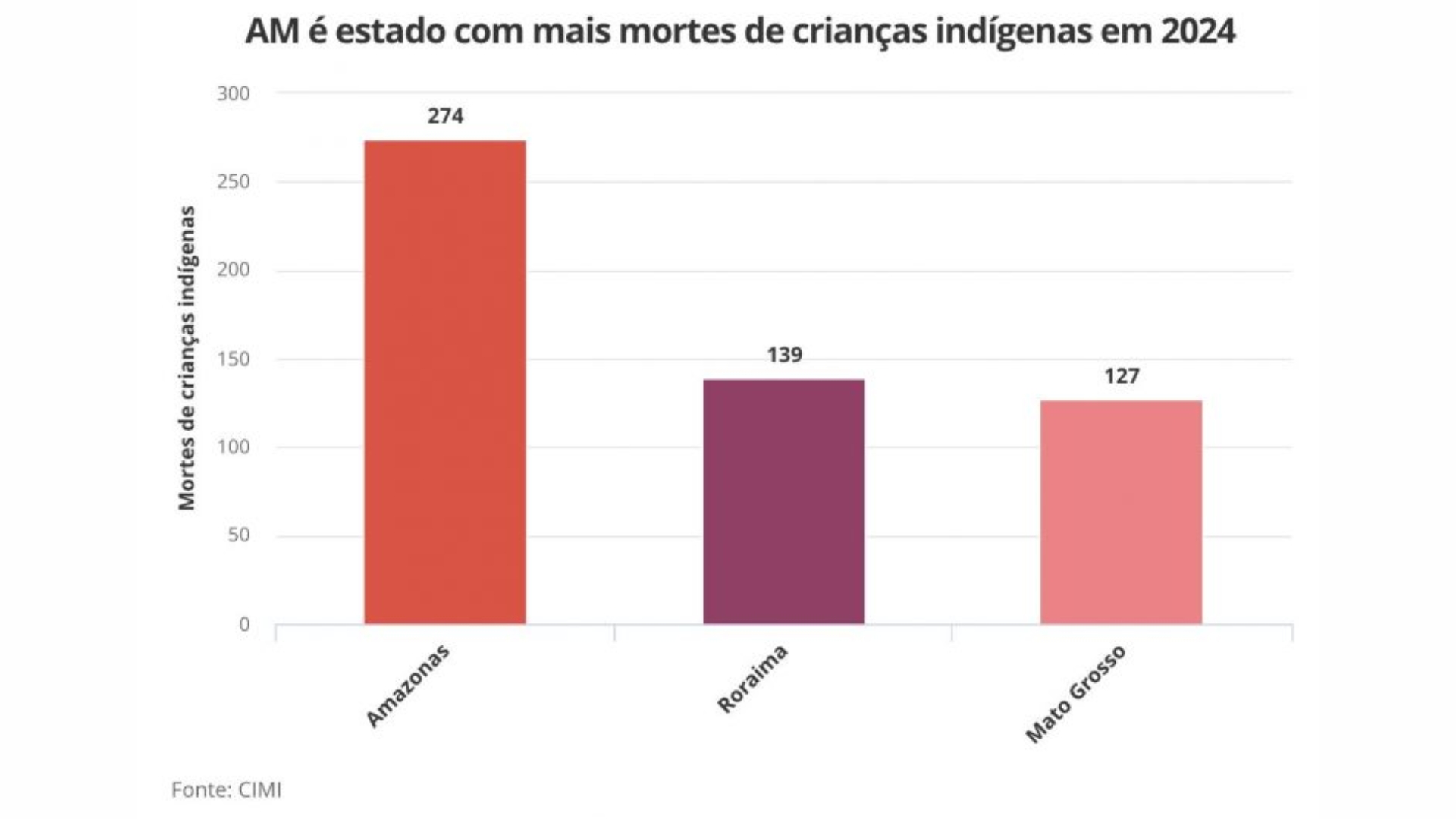 Segundo o documento, 274 crianças indígenas de até 4 anos morreram no Amazonas em 2024. As principais causas das mortes foram pneumonia (103 casos), diarreia (64) e desnutrição (43), todas relacionadas à falta de acesso a serviços básicos de saúde e infraestrutura. O estado lidera o ranking nacional, seguido por Roraima (139 casos) e Mato Grosso (127).