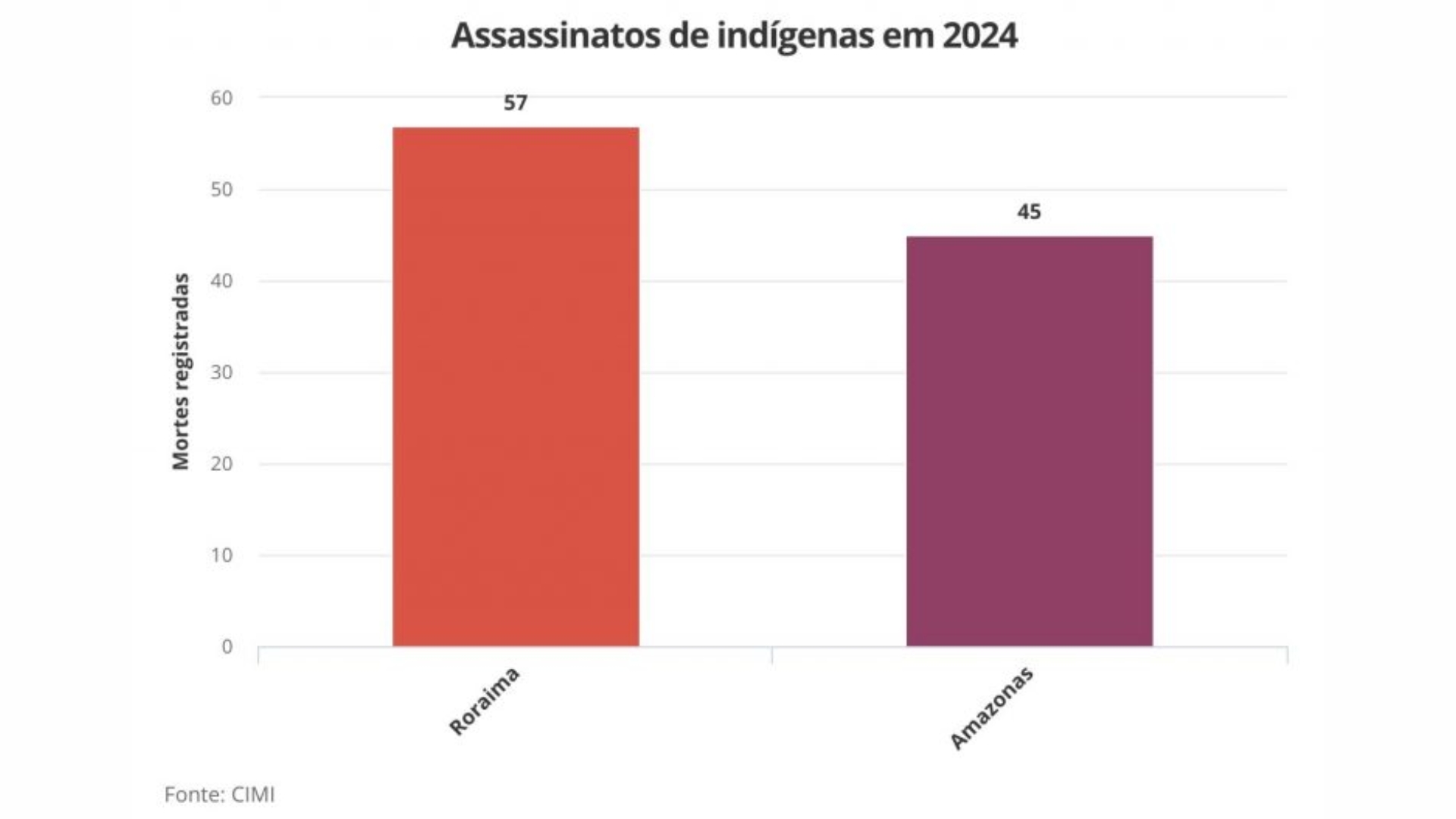 O relatório também aponta o Amazonas como o segundo estado com mais registros de assassinatos de indígenas no mesmo período, com 45 casos. Roraima lidera nesse indicador, com 57 mortes. A violência física se soma à violência estrutural enfrentada pelas comunidades, marcada pela ausência de políticas públicas eficazes.