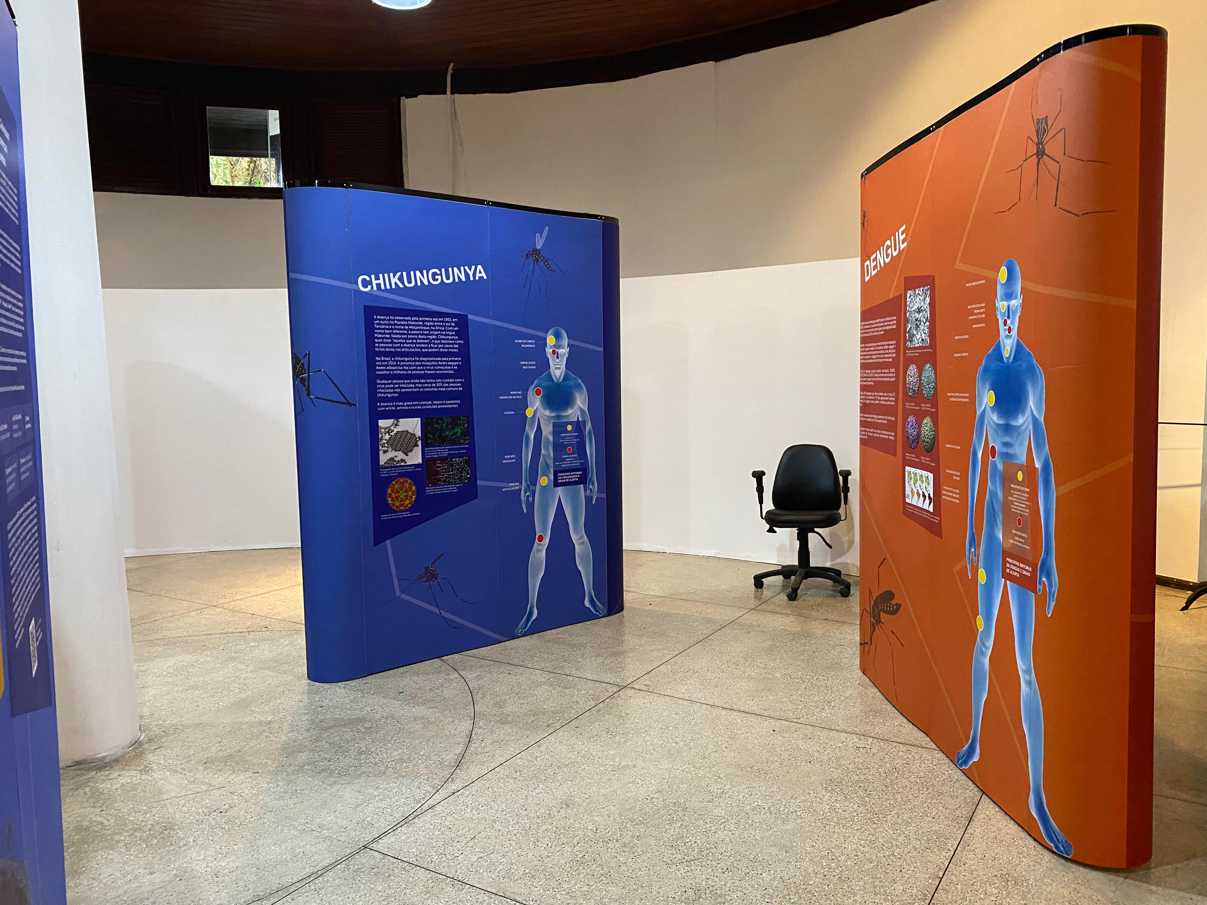 A exposição explora o comportamento e as características de mosquitos transmissores de arboviroses, como dengue, zika e chikungunya, por meio de módulos interativos