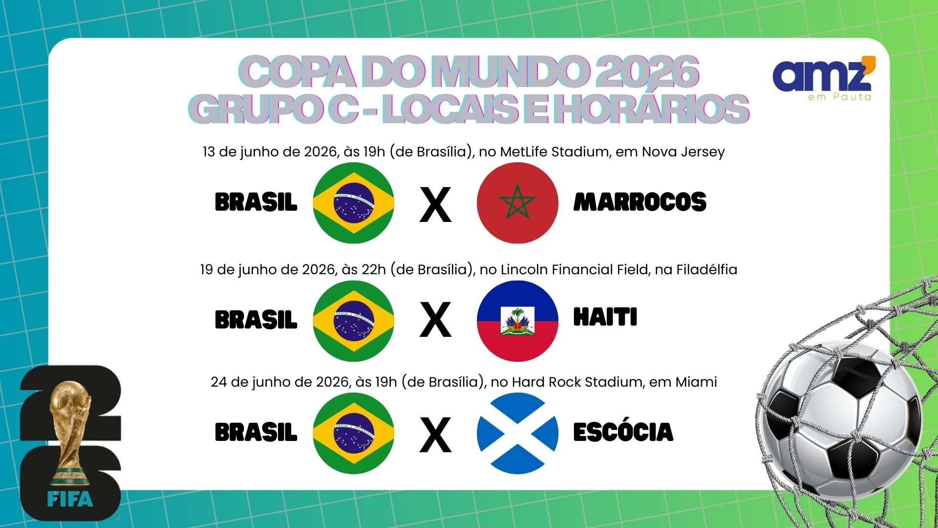A Fifa oficializou neste sábado (6) a tabela completa da Copa do Mundo de 2026, confirmando os horários e locais das três partidas da seleção brasileira na fase de grupos. Após ser sorteado na última sexta-feira (5), o Brasil caiu no Grupo C ao lado de Marrocos, Escócia e Haiti, mas restava saber em quais cidades os duelos seriam disputados. Com a divulgação, a equipe de Carlo Ancelotti já sabe exatamente onde começará sua caminhada rumo ao hexa.
