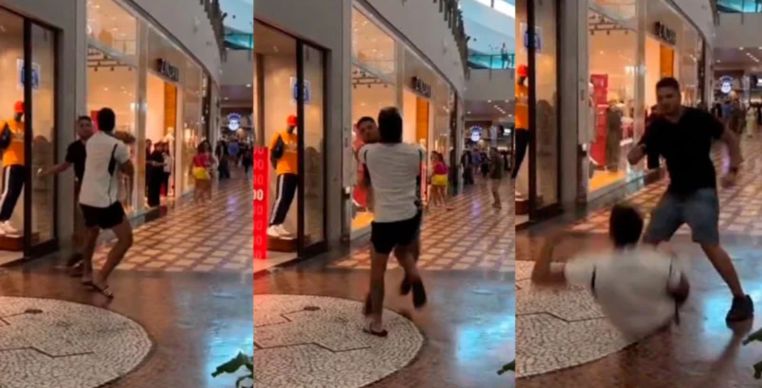 Pouco depois, um segundo homem, identificado como o marido da suspeita, surge segurando um banco de madeira e tenta atingir o homem que estava imobilizando sua esposa. A tentativa de agressão foi interrompida por um segurança do shopping e por outro cliente, que conseguiram conter o agressor antes que a situação se agravasse.