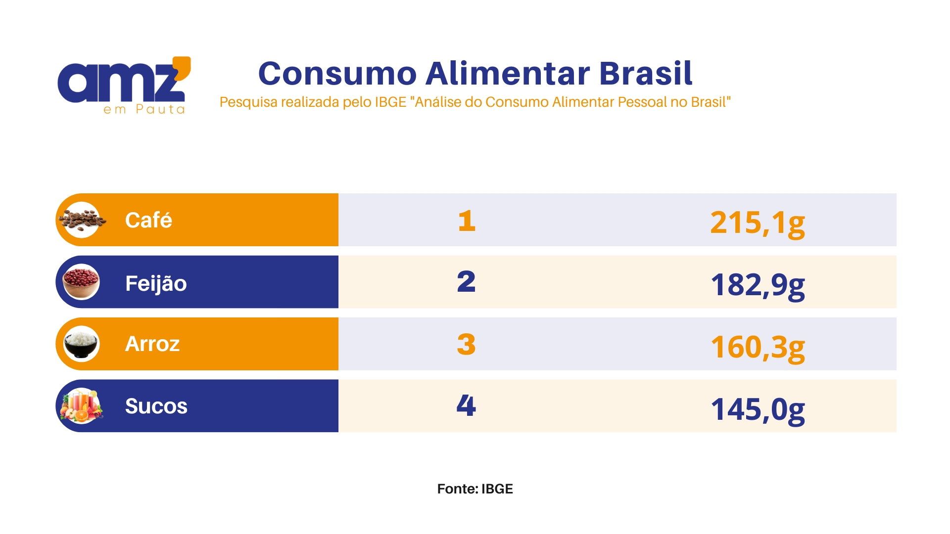 Um levantamento do Instituto Brasileiro de Geografia e Estatística (IBGE), com base no estudo "Análise do Consumo Alimentar Pessoal no Brasil", revelou que o café é o alimento mais consumido entre os brasileiros, com uma média de 215,1g por dia. Em seguida, aparecem o feijão (182,9g) e o arroz (160,3g), itens clássicos da culinária nacional. Outros produtos também figuram na lista, como sucos (145,0g), refrigerantes (94,7g) e carne bovina (63,2g), destacando a diversidade da dieta brasileira.