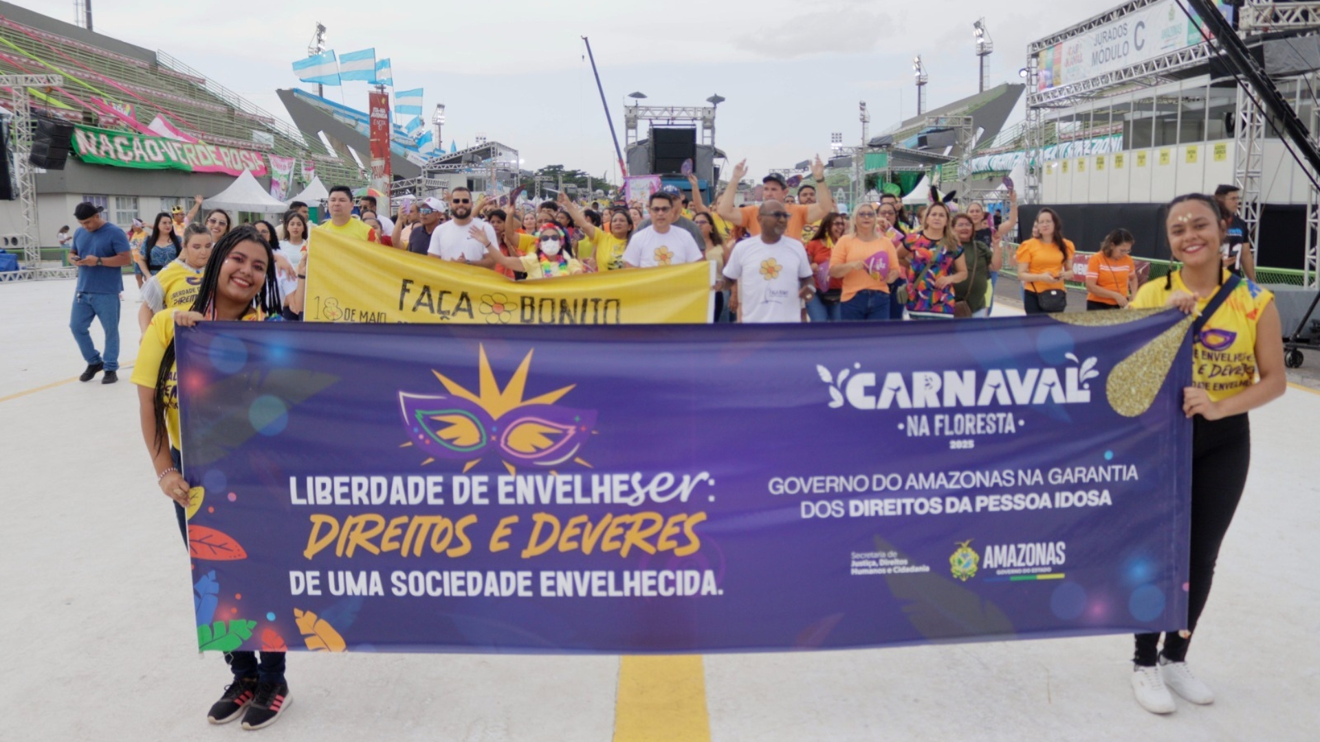 Neste sábado (01/03), aproximadamente 3 mil idosos participaram do Desfile da Pessoa Idosa 2025, realizado no Sambódromo, na zona centro-sul de Manaus. O evento, coordenado pela Secretaria de Estado de Justiça, Direitos Humanos e Cidadania (Sejusc), antecedeu as apresentações das escolas de samba do Grupo Especial e fez parte das festividades do Carnaval na Floresta 2025.