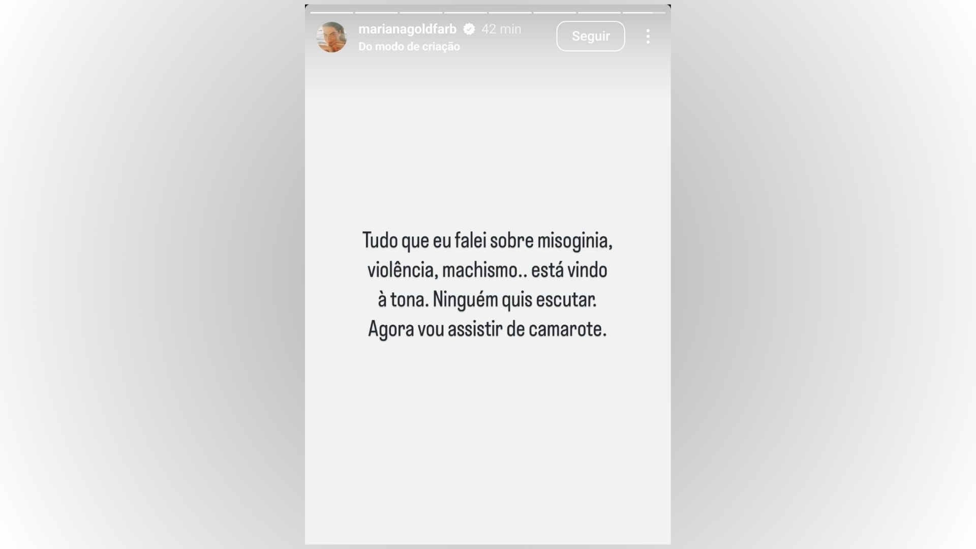 Anteriormente, em janeiro deste ano, ela já havia comentado sobre não citar o nome do ex. “Porque a causa é muito maior do que o cara. O cara não tem importância”, afirmou. A repercussão nas redes gerou debates sobre conduta nos bastidores e machismo no meio artístico.