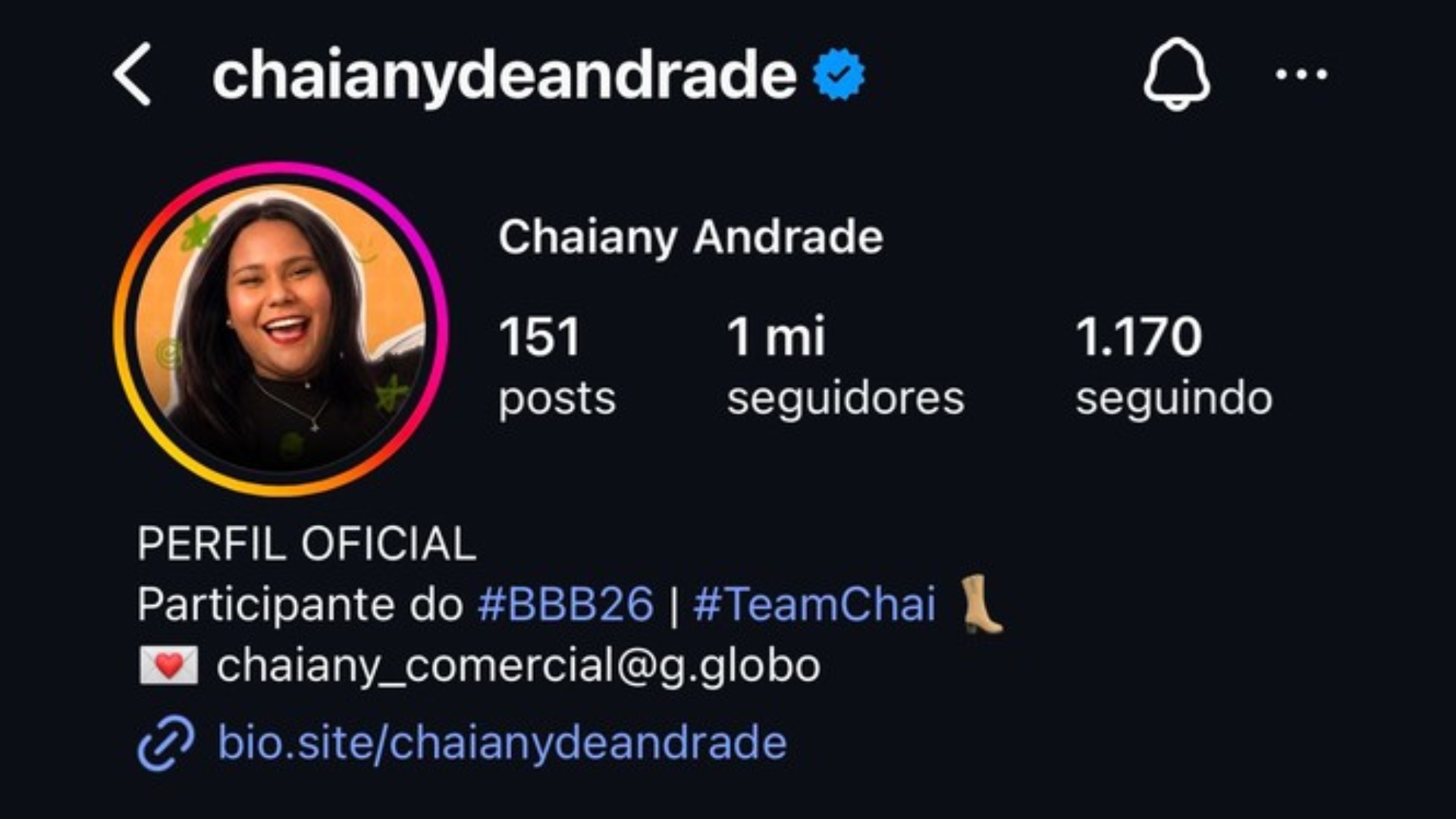 Chaiany se tornou a primeira participante do grupo Pipoca do BBB 26 a atingir a marca de 1 milhão de seguidores no Instagram ainda na segunda semana do reality show, consolidando o maior crescimento nas redes entre os competidores da mesma categoria.