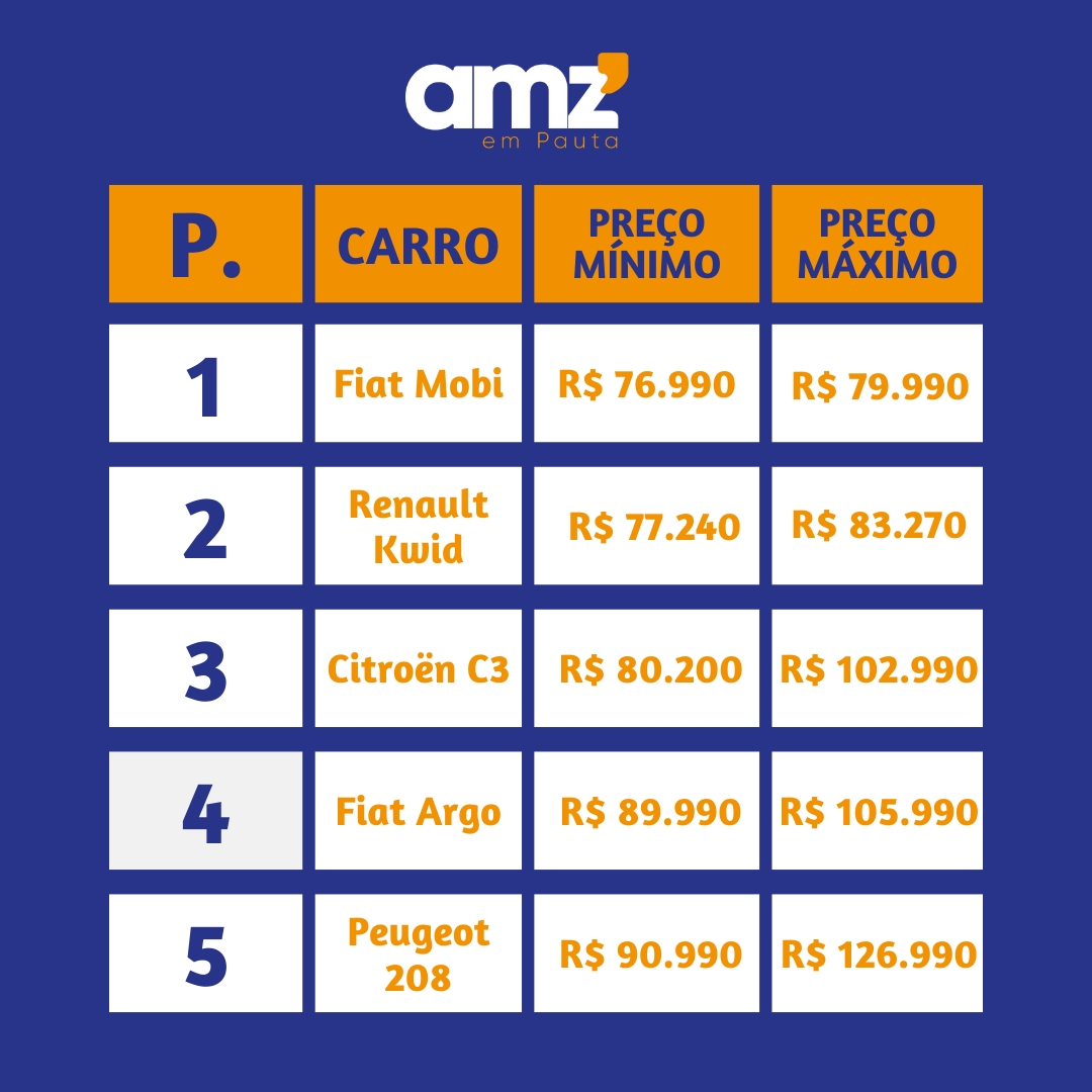 O Peugeot 208 abre a lista dos mais baratos, com preço inicial de R$ 90.990 na versão Active. Importado da Argentina, o hatch compacto conta com motor 1.0 Firefly flex de 75 cv e 105 Nm, acoplado a um câmbio manual de cinco marchas. A versão mais cara, GT, chega a R$ 126.990 e traz motor 1.0 turbo de 130 cv e câmbio CVT.