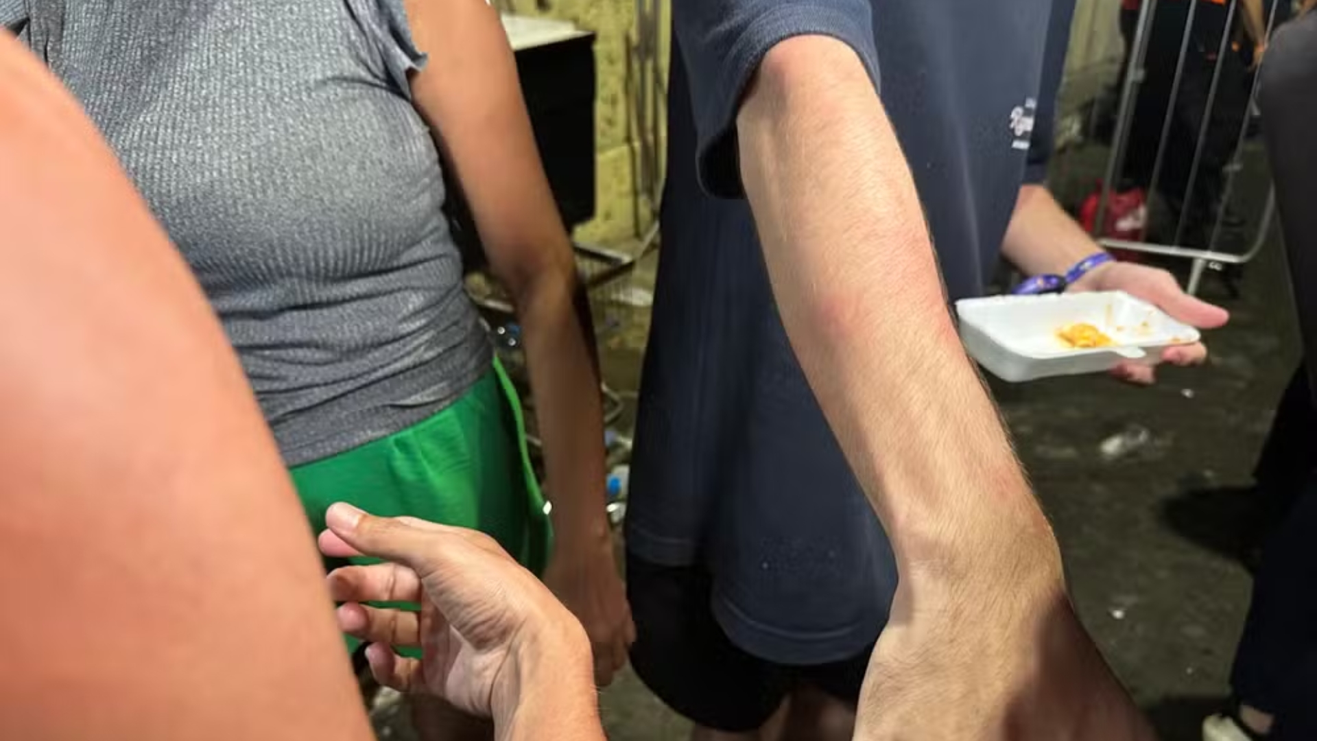 O estudante Cristiano de Souza relatou que, mesmo com pulseira em mãos, não conseguiu acessar a área. Ele mostrou queimaduras nos braços e ombros provocadas pelo produto químico. “Tinha idoso e criança passando mal, e mesmo assim jogaram spray de pimenta. Foi uma palhaçada. Não organizaram direito, não tinha espaço pra sair nem pra entrar, estava tudo uma muvuca”, disse.