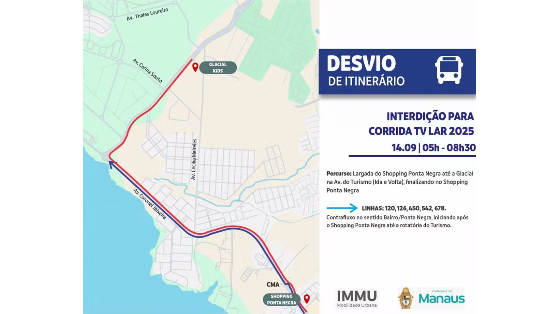 A Prefeitura de Manaus vai modificar o trânsito e o transporte público neste domingo (14) por causa da corrida “TV Lar 2025”. A largada está prevista para as 6h na Avenida Coronel Teixeira, próximo ao shopping Ponta Negra, na Zona Oeste da capital. A medida busca garantir segurança e fluidez durante o evento esportivo.