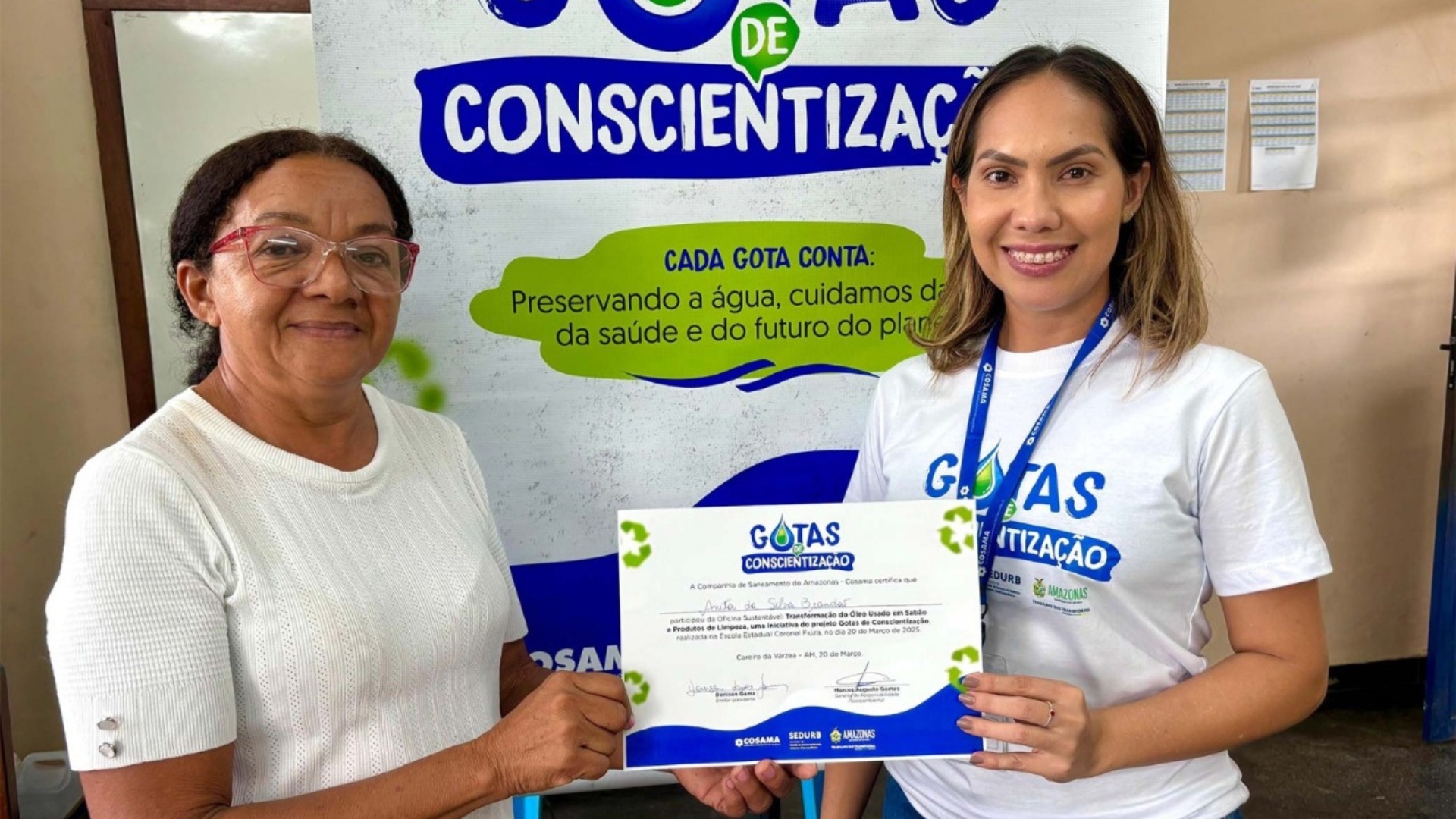 A Companhia de Saneamento do Amazonas (Cosama) lançou, na quinta-feira (20/03), o Projeto Gotas de Conscientização, em alusão ao Dia Mundial da Água, comemorado em 22 de março. O projeto visa incentivar práticas sustentáveis para a preservação dos recursos hídricos e o reaproveitamento de resíduos. A primeira ação aconteceu no município de Careiro da Várzea (a 25 quilômetros de Manaus) e consistiu na Oficina Sustentável: Transformação do Óleo Usado em Sabão e Produtos de Limpeza, ministrada pelos técnicos da Gerência de Responsabilidade Socioambiental (Gersam) e colaboradores da agência local.