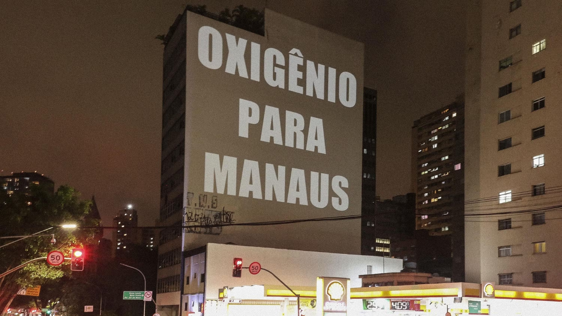 Projeção no centro da cidade de São Paulo, SP, com os dizeres ¨Oxigênio pra Manaus¨, nesta quinta-feira, 14.