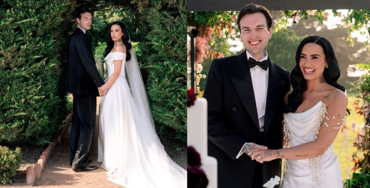 As celebrações começaram no sábado (24), com um jantar pré-casamento no tradicional Arnoldi's Café. Para a ocasião, Demi surgiu em um vestido branco sem alças com fenda, assinado pela estilista Monique Lhuillier. No dia seguinte, para a cerimônia oficial, a artista usou um vestido Vivienne Westwood branco pérola, feito especialmente para ela.