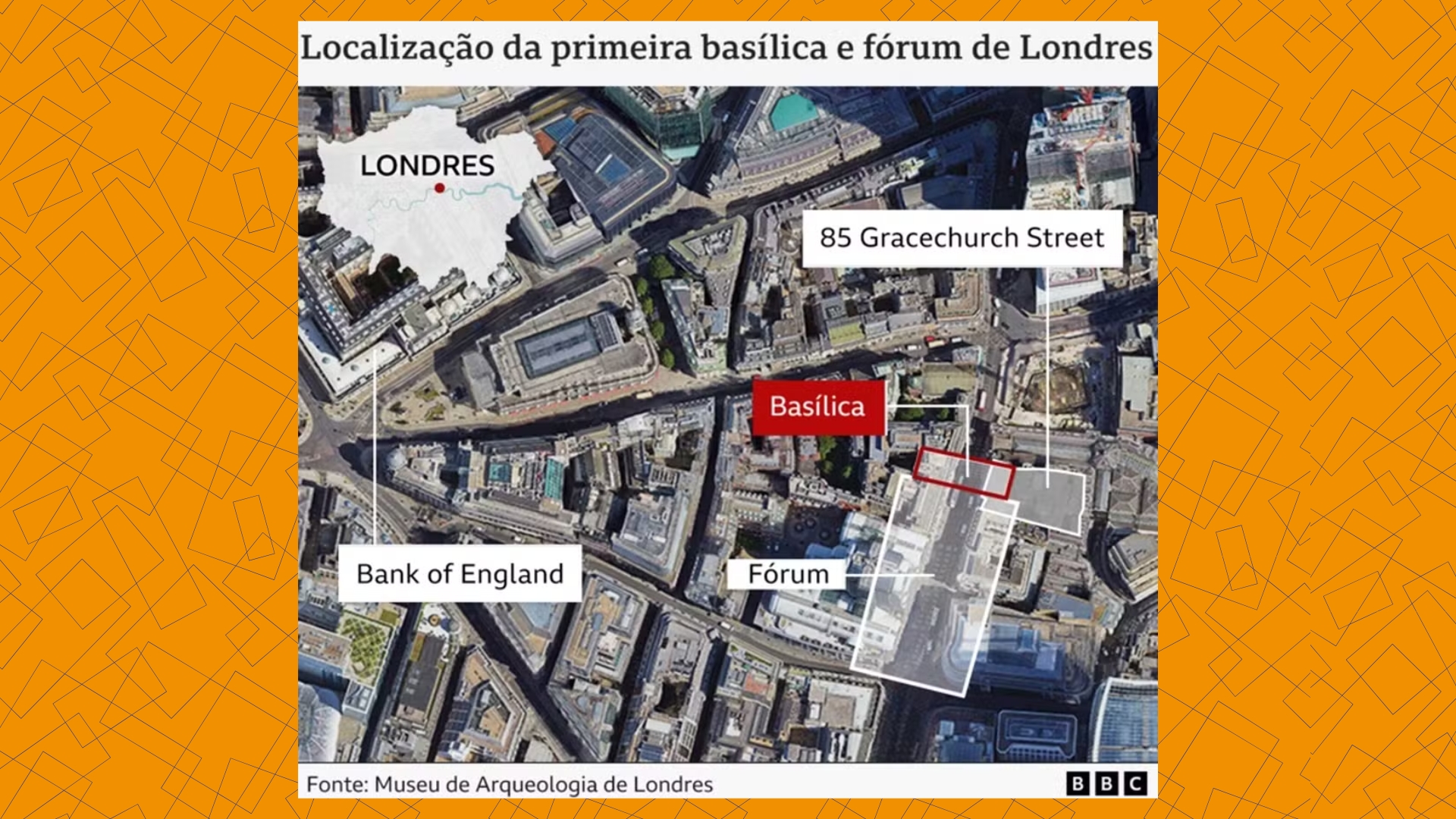 Mapa mostra a localização da primeira basílica e fórum de Londres — Foto: BBC