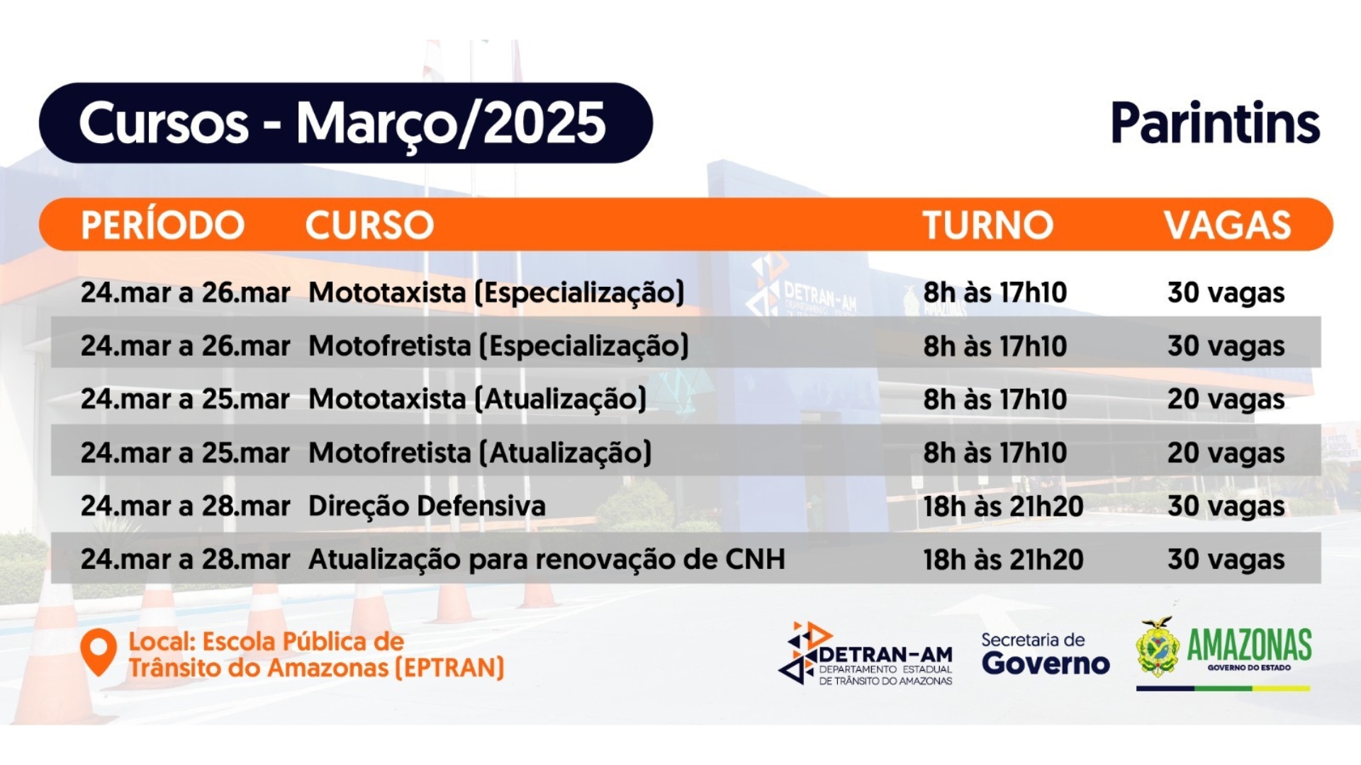 O Departamento Estadual de Trânsito do Amazonas (Detran-AM), por meio da Escola Pública de Trânsito (Eptran), anunciou a abertura de 160 vagas para seis cursos voltados ao aprimoramento e atualização de motoristas e motociclistas no município de Parintins, localizado a 369 quilômetros de Manaus. As aulas serão realizadas no final de março, com opções de horários pela manhã, tarde e noite.