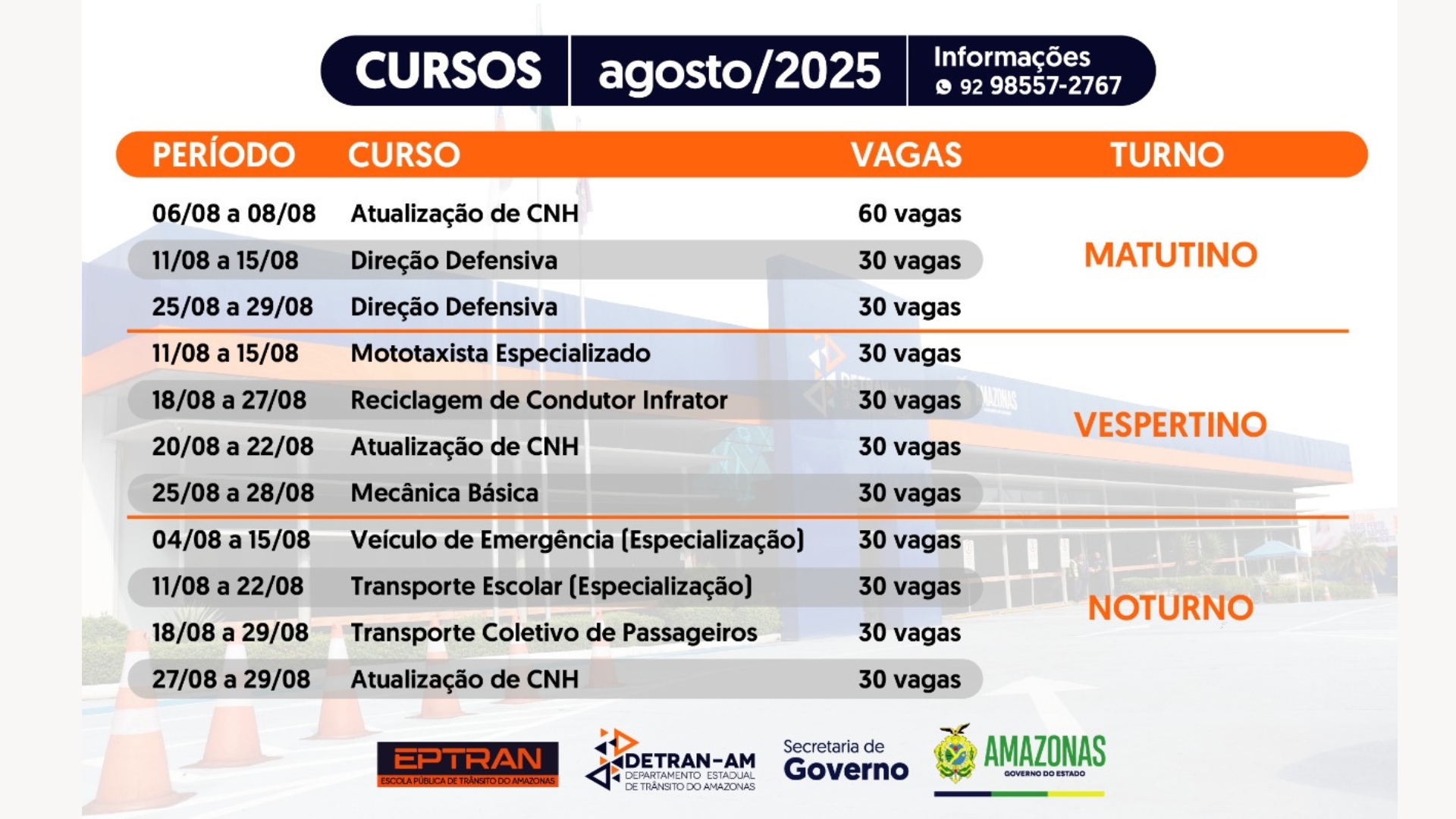 O Departamento Estadual de Trânsito do Amazonas (Detran-AM), por meio da Escola Pública de Trânsito (Eptran), está com inscrições abertas para cursos gratuitos que serão ministrados ao longo do mês de agosto. Ao todo, 360 vagas estão sendo oferecidas para os turnos matutino, vespertino e noturno.