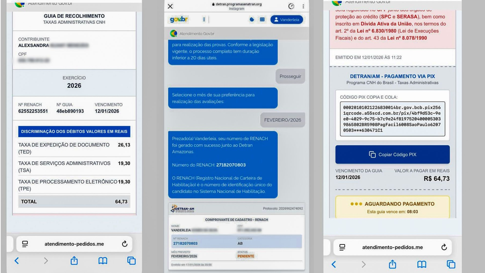 De acordo com o Detran-AM, ao acessar o site falso, a vítima é direcionada para um suposto chat automático, que solicita informações e apresenta opções de serviços. Após o envio dos dados, é gerado um código Pix para pagamento, o que não faz parte do procedimento oficial do programa.