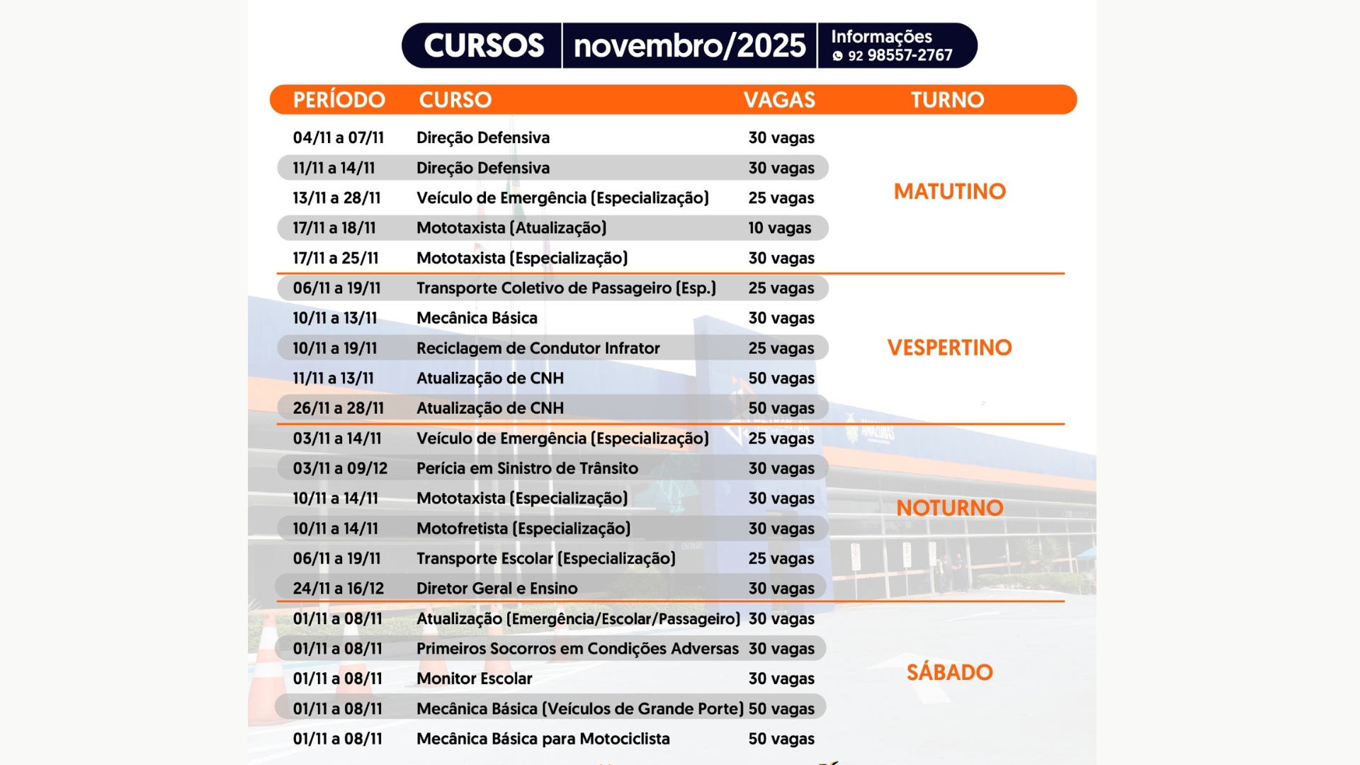No turno da manhã, duas turmas de Direção Defensiva (30 vagas cada) serão abertas, a primeira no dia 4 de novembro e a segunda no dia 11. Também pela manhã, o curso de Especialização para Condutor de Veículo de Emergência (25 vagas) terá início em 13 de novembro, enquanto os cursos de Atualização de Mototaxista (10 vagas) e Especialização para Mototaxista (30 vagas) começarão no dia 17.