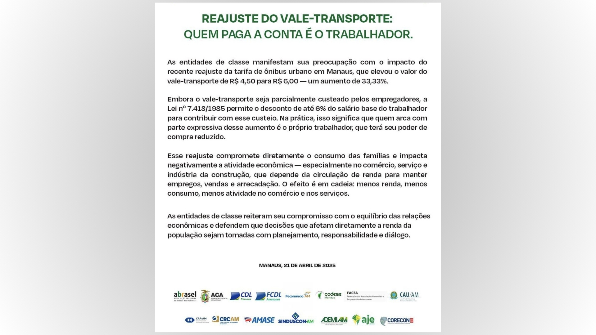 O aumento das tarifas de ônibus em Manaus provocou reação de entidades empresariais e conselhos profissionais. Em nota conjunta, 16 instituições afirmaram que o reajuste “compromete a renda do trabalhador e provoca efeitos negativos em cadeia sobre o comércio, os serviços e a indústria”. A medida altera valores pagos por trabalhadores, estudantes e usuários do transporte público.