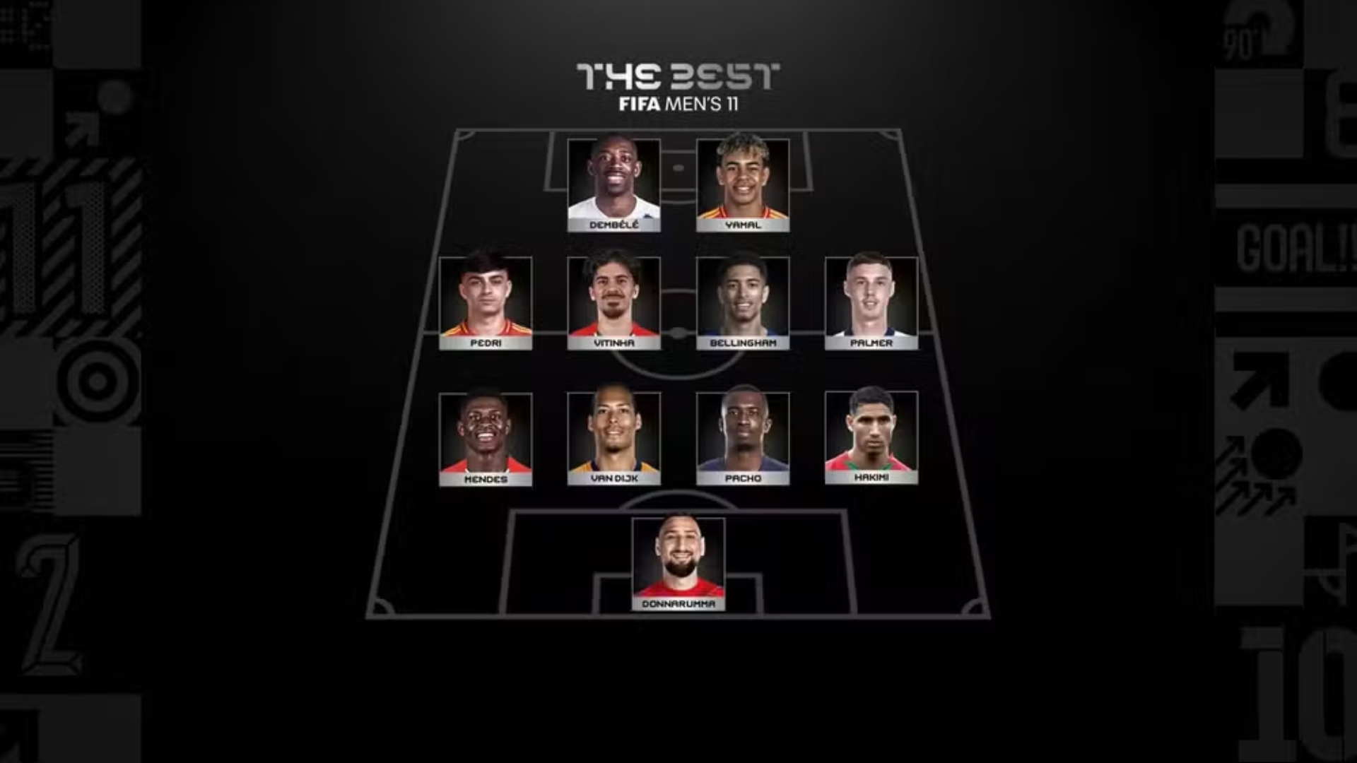 O meio-campo masculino foi composto por Cole Palmer, do Chelsea, Jude Bellingham, do Real Madrid, Vitinha, do Paris Saint-Germain, e Pedri, do Barcelona. Já o setor ofensivo reuniu Lamine Yamal, do Barcelona, e Ousmane Dembélé, do Paris Saint-Germain, ambos entre os jogadores mais influentes da temporada.