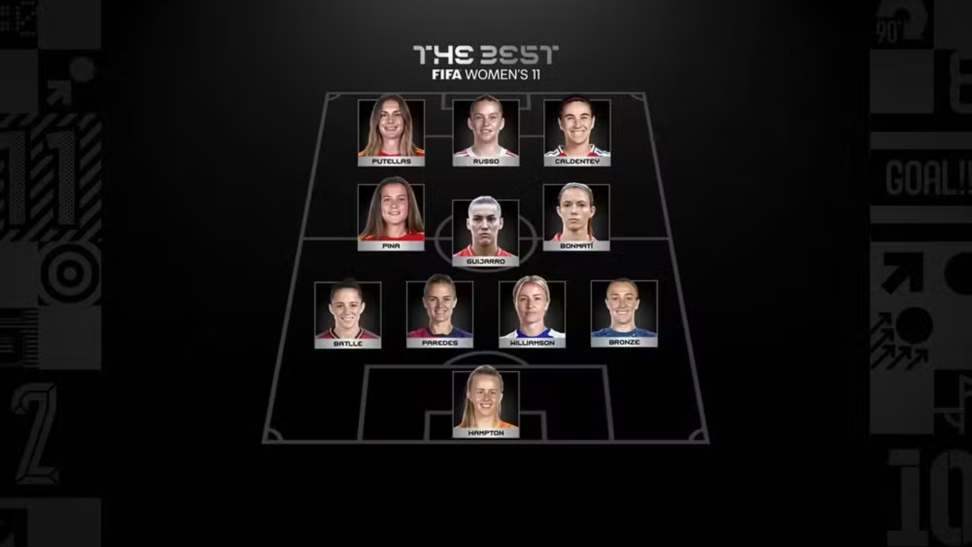 No meio-campo feminino, a votação consagrou Ona Batlle, Aitana Bonmatí e Patri Guijarro, todas do Barcelona, evidenciando a força do clube espanhol na modalidade. O ataque foi formado por Claudia Pina, do Barcelona, Mariona Caldentey, do Arsenal, Alessia Russo, do Arsenal, e Alexia Putellas, do Barcelona.