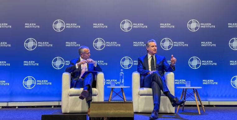 Governador da Califórnia, Gavin Newsom, participa de Simpósio Global de Investidores do Instituto Milken em São Paulo em 10 de novembro de 2025.