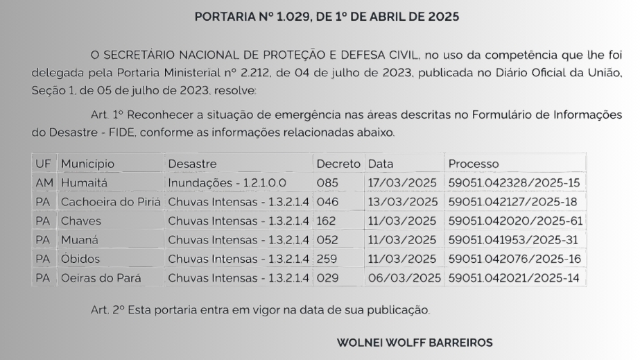 A cidade de Humaitá, no Amazonas, teve sua situação de emergência reconhecida pelo Governo Federal na última quarta-feira (2), devido aos impactos das inundações. A decisão foi oficializada por meio de uma portaria publicada no Diário Oficial da União (DOU).