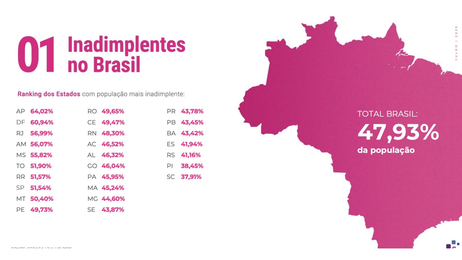 Além das dívidas de pessoas físicas, a Serasa identificou um recorde de empresas negativadas em julho. O fenômeno reflete a fragilidade do consumo, os juros elevados e a dificuldade de investimento, gerando um ciclo de retração econômica que atinge diretamente a geração de empregos e renda.