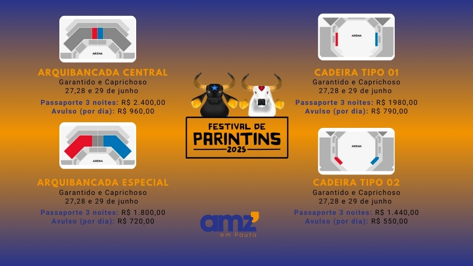 Os bois Caprichoso e Garantido, em parceria com a Amazon Best, anunciam o início das vendas para o Festival Folclórico de Parintins 2025. A comercialização começa neste sábado, 21 de dezembro, às 9h (horário de Manaus), exclusivamente no site bilheteriadigital.com.br.
