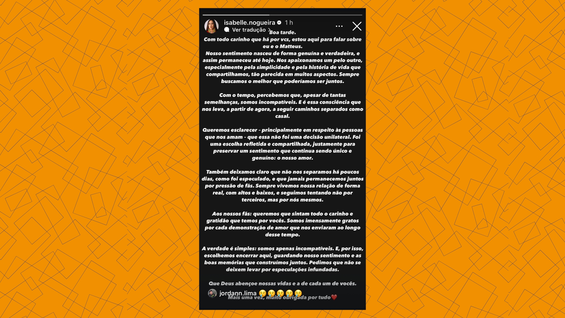 "Com o tempo, percebemos que, apesar de tantas semelhanças, somos incompatíveis. E é essa consciência que nos leva, a partir de agora, a seguir caminhos separados como casal. Queremos esclarecer - principalmente em respeito às pessoas que nos amam - que essa não foi uma decisão unilateral. Foi uma escolha refletida e compartilhada, justamente para preservar um sentimento que continua sendo único e genuíno: nosso amor."