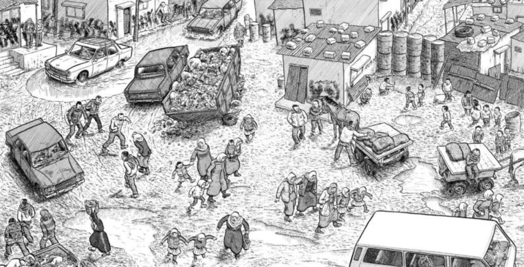“Palestina”, de Joe Sacco, é uma reportagem em quadrinhos que retrata o cotidiano de palestinos durante a ocupação israelense, baseada na experiência do autor em campo. Joe Sacco, jornalista espanhol que se tornou referência no segmento vai até os lugares, conversa com as pessoas de todos os lados e ilustra as conversas com seu traço que não tem a obrigação de ser anatomicamente realista. A obra apresenta relatos de civis, mostrando violência, restrições e impactos sociais do conflito, com foco em dar voz às pessoas afetadas.