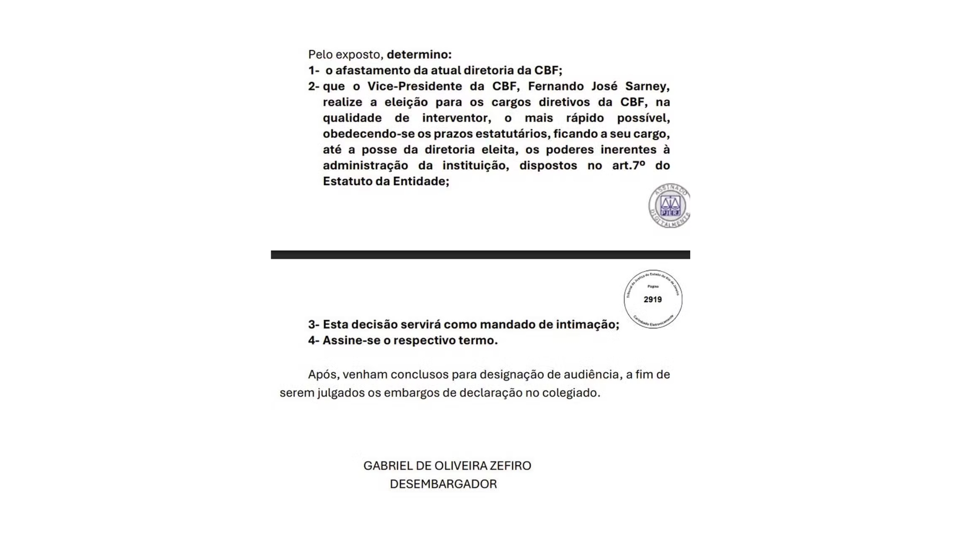 O presidente da Confederação Brasileira de Futebol (CBF), Ednaldo Rodrigues, foi afastado do cargo nesta quinta-feira (15) pelo Tribunal de Justiça do Rio de Janeiro (TJ-RJ). A decisão foi assinada pelo desembargador Gabriel de Oliveira Zéfiro, que nomeou Fernando Sarney como interventor, determinando a convocação de novas eleições “o mais rápido possível”.
