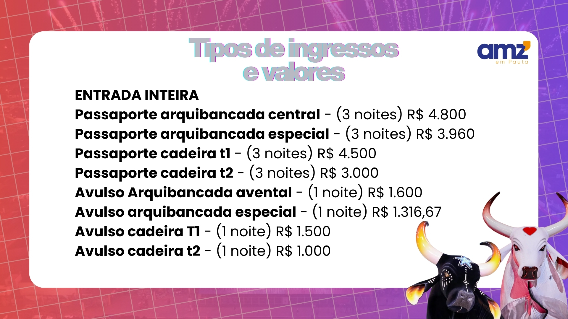 Os preços dos ingressos para 2026 foram divulgados pela organização e incluem opções de passaportes e entradas avulsas para diferentes setores, com valores variando entre arquibancadas e cadeiras numeradas. Também são disponibilizadas versões com meia-entrada conforme a legislação.
