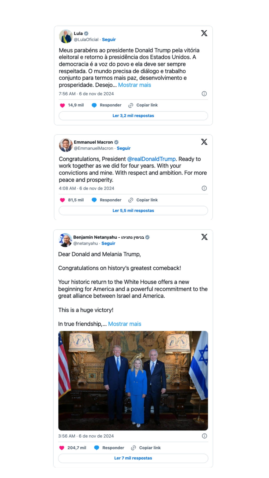 O primeiro-ministro israelense, Benjamin Netanyahu, celebrou o “retorno histórico” de Trump, destacando o compromisso renovado com a aliança entre Israel e os EUA. Em uma linha semelhante, Javier Milei, presidente da Argentina, apresentou solicitação e declarou seu apoio ao republicano. O secretário-geral da OTAN, Mark Rutte, reforçou a importância da liderança de Trump para a manutenção da aliança transatlântica, especialmente num momento de tensão global.