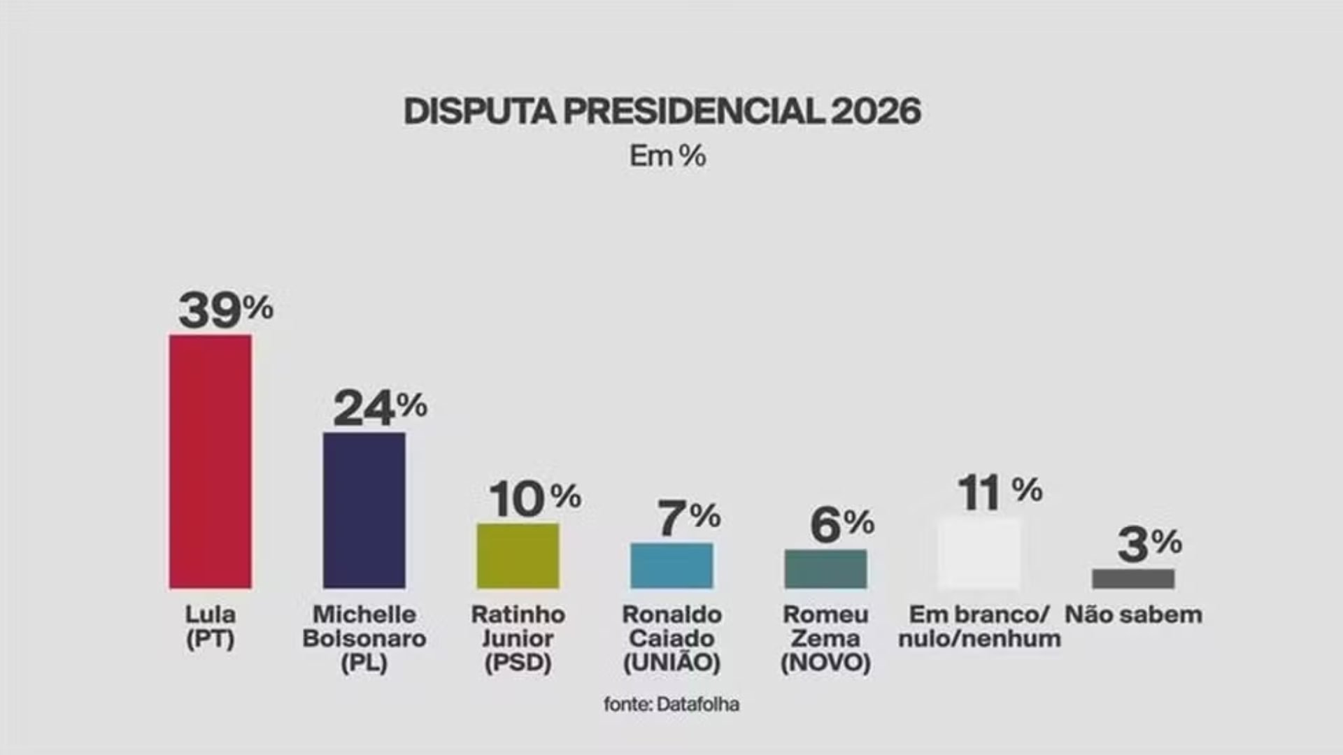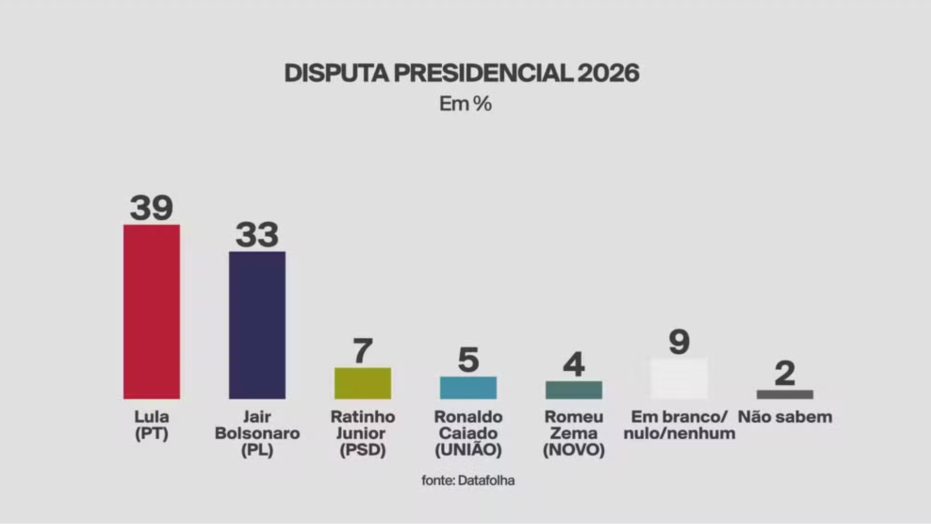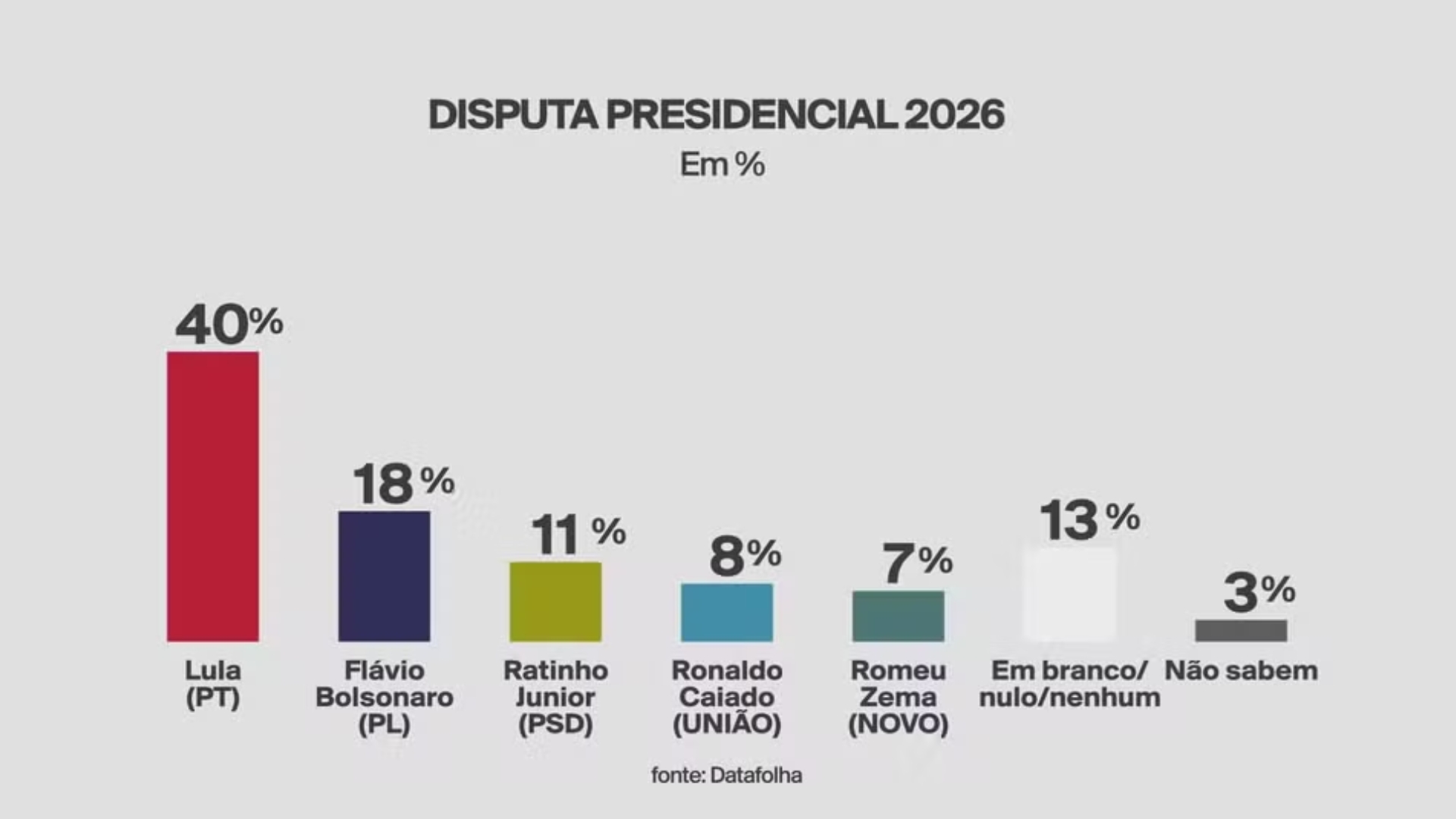Entre os filhos de Bolsonaro testados na pesquisa, Lula atinge 40% contra 18% de Flávio Bolsonaro; 39% contra 20% de Eduardo Bolsonaro; e 39% contra 24% de Michelle Bolsonaro. Já contra o governador de São Paulo, Tarcísio de Freitas, Lula aparece com 38%, enquanto o ex-ministro de Bolsonaro marca 21%. Em todos esses cenários, o petista mantém uma liderança confortável, enquanto os demais concorrentes figuram com percentuais mais tímidos, como Ratinho Junior (até 14%), Zema (até 7%) e Caiado (até 8%).