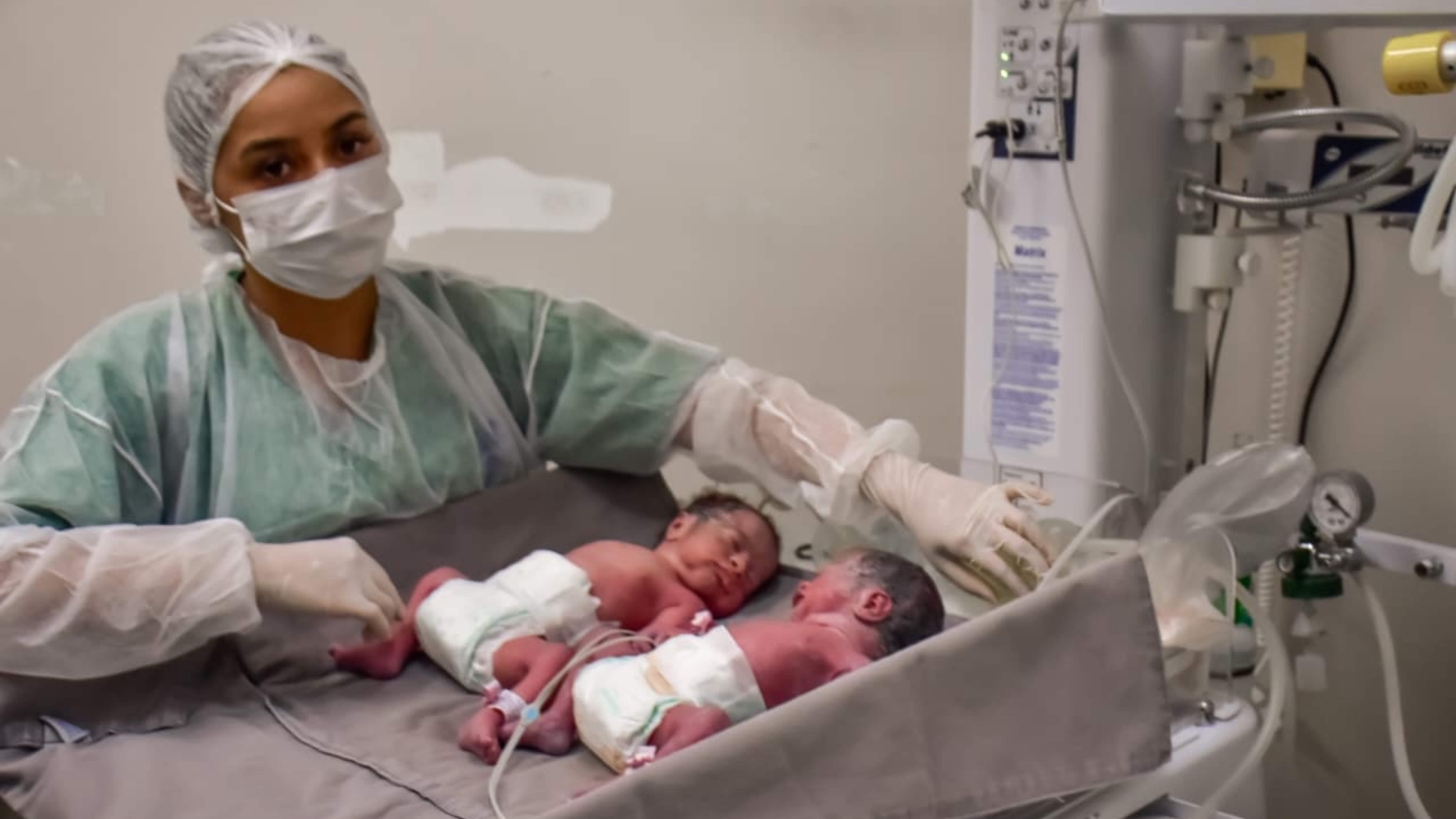 Logo após o parto, os bebês precisaram de suporte ventilatório não invasivo para auxiliar na respiração e seguem sob cuidados na Unidade de Terapia Intensiva Neonatal. O acompanhamento contínuo visa garantir o desenvolvimento adequado nos primeiros dias de vida.