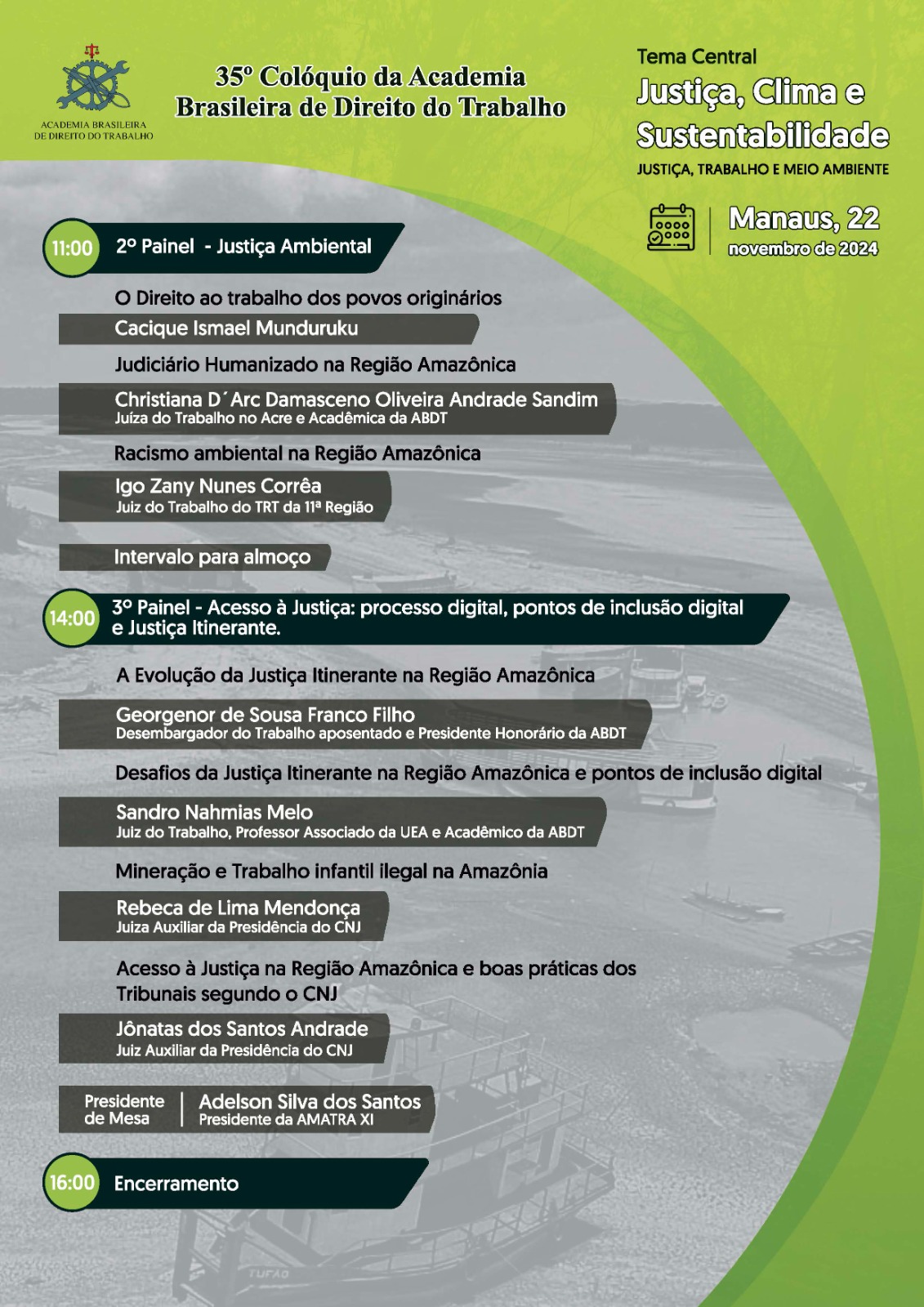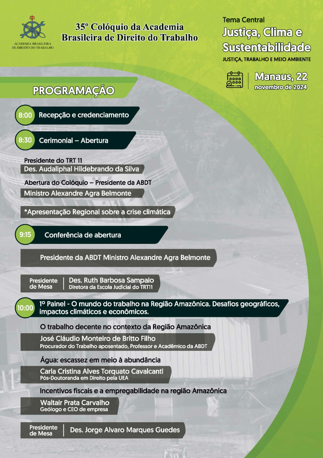 A cidade de Manaus será palco do 35º Colóquio da Academia Brasileira de Direito do Trabalho (ABDT), com o tema "Justiça, Clima e Sustentabilidade". O evento ocorre em parceria com o Tribunal Regional do Trabalho da 11ª Região (AM/RR) e a Escola Judicial (Ejud11), nesta sexta-feira (22/11), das 8h às 16h, no Auditório do Fórum Trabalhista Ministro Mozart Victor Russomano, localizado na Rua Ferreira Pena, nº 546, Centro.