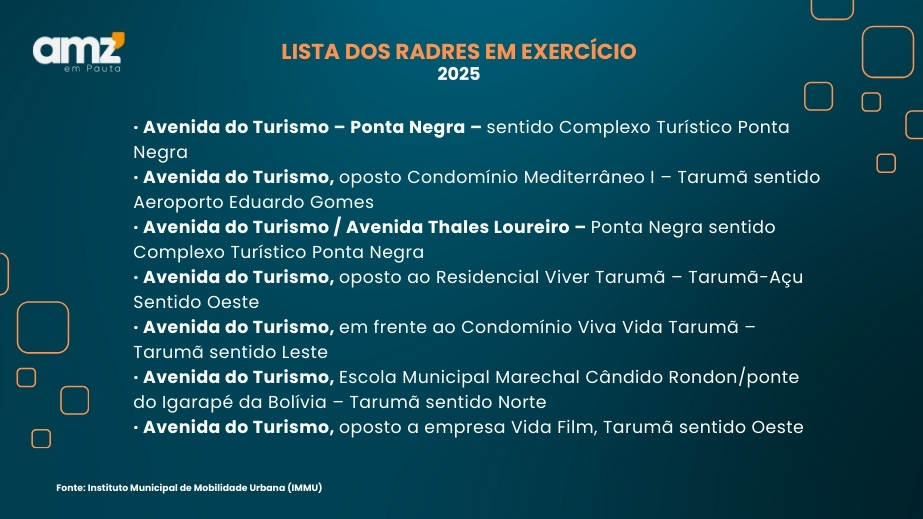 Um dos novos radares está sendo instalado na Avenida Coronel Jorge Teixeira (Estrada da Ponta Negra), próximo ao supermercado Yroyak. Os locais dos demais equipamentos ainda não foram divulgados. Segundo o IMMU, os pontos foram definidos com base em estudos técnicos que identificam áreas com alto índice de acidentes, especialmente os fatais, e cruzamentos com recorrência de avanço de sinal.