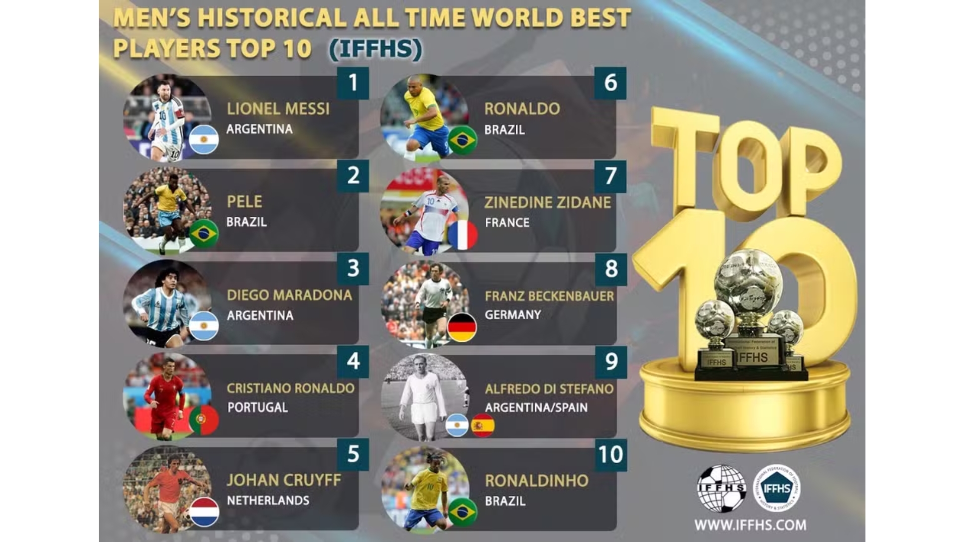A IFFHS (Federação Internacional de História e Estatísticas do Futebol) divulgou um ranking com os 10 maiores jogadores da história do futebol mundial. A principal surpresa da lista foi a liderança do argentino Lionel Messi, que superou o brasileiro Pelé, colocado em segundo lugar.