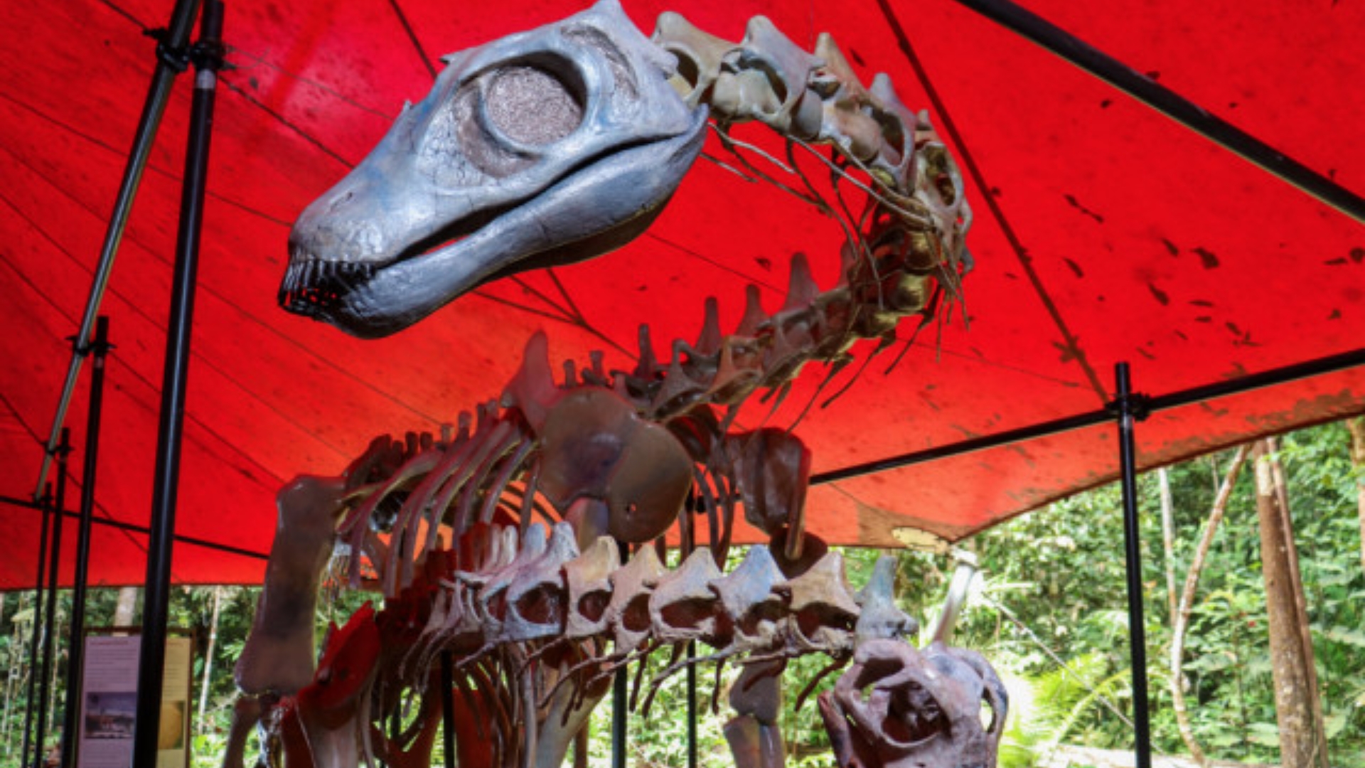 As réplicas dos esqueletos são do Aum amazonsauro (de 10 metros de comprimento), um Eremotherium (uma preguiça gigante de 4 metros de altura) e um purussauro (um jacaré de 13 metros de comprimento). Os animais viveram na Amazônia em três períodos: 115 milhões de anos, 5 milhões e 11 mil anos atrás.