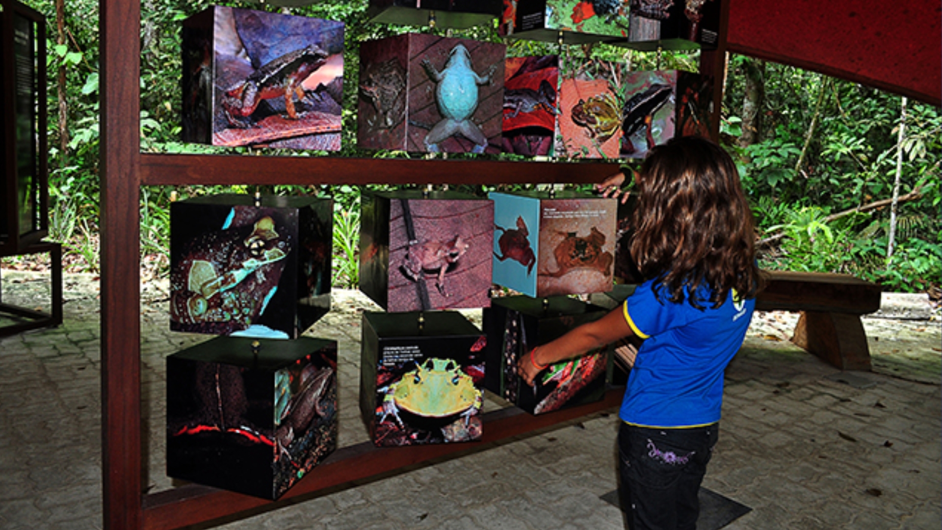 Durante a exposição, o visitante encontra painéis explicativos, aquários, terrário, réplicas de muiraquitãs, o Jogo do Cururu e o Tangram das Briófitas. A visita se completa com uma caminhada pela Trilha dos Sapos, que passa por dez pontos relacionados à vida desses animais.