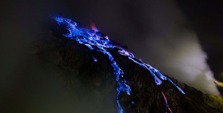 No leste de Java, na Indonésia, o complexo vulcânico Kawah Ijen fascina viajantes e cientistas com um fenômeno que parece saído de um filme de fantasia: o “fogo azul”. A cena, visível principalmente à noite, não é de fato lava colorida, mas sim o resultado da queima de gás sulfúrico. Quando exposto ao oxigênio e a temperaturas acima de 600 °C, o enxofre em combustão produz chamas de tom intenso, criando um espetáculo único no planeta.