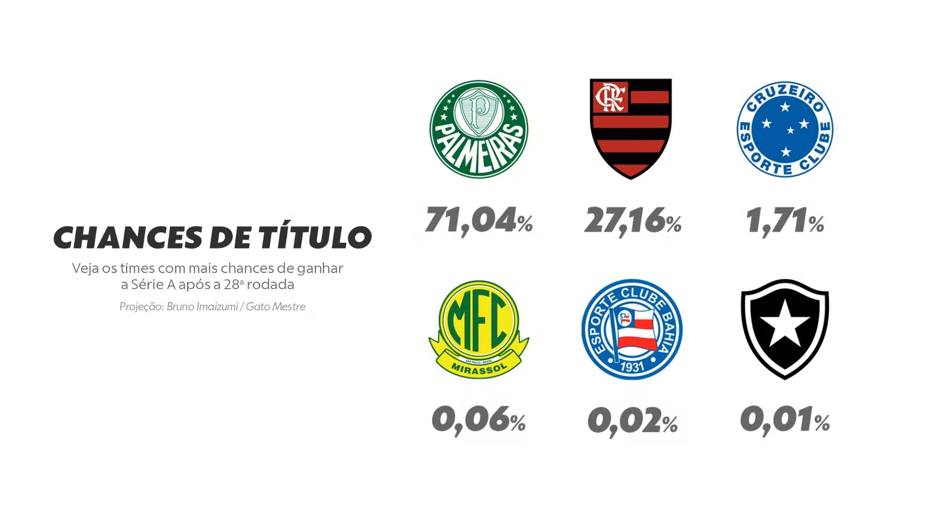 Por outro lado, o Cruzeiro praticamente deu adeus à disputa. O empate por 1 a 1 no clássico mineiro derrubou suas chances de título de 8% para apenas 1,71%, afastando o clube da corrida pela taça.