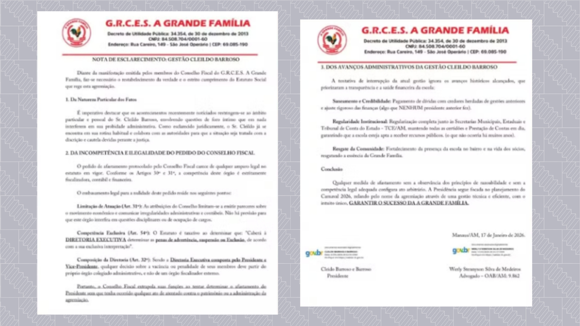 “Resolvemos pedir o afastamento imediato até que os fatos sejam esclarecidos, a fim de desvincular o nome da Escola destes acontecimentos, tendo em vista a proximidade do Carnaval 2026 e para que isso não gere um impacto negativo”, afirma a nota divulgada pelo Conselho Fiscal.