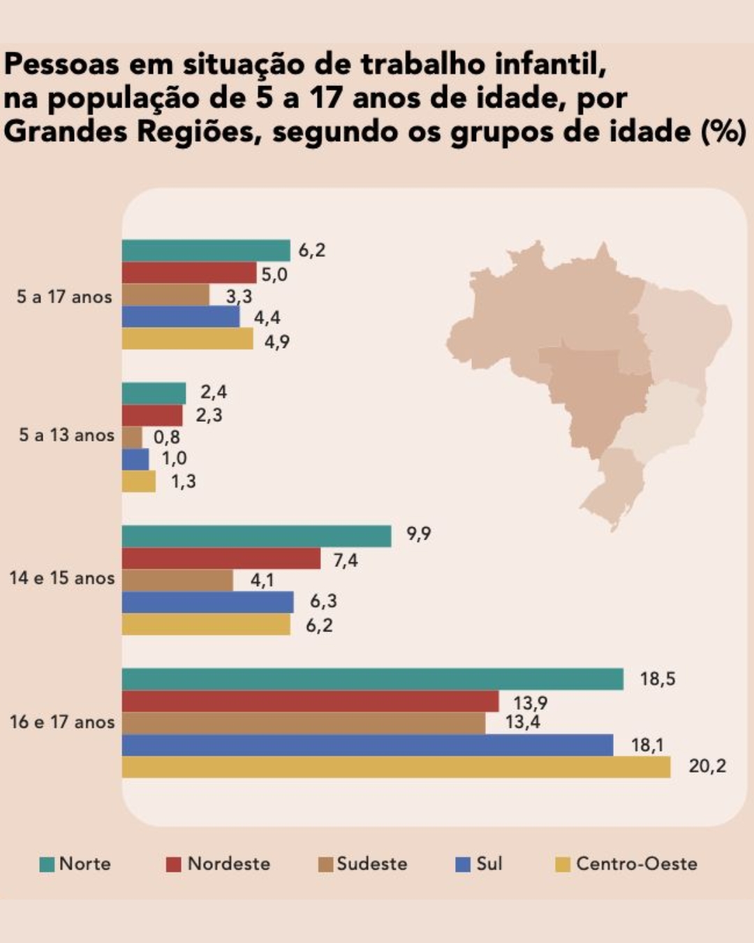 Quando se observa o contingente total, o Nordeste aparece na frente, com 547 mil menores em trabalho infantil, seguido do Sudeste (475 mil), Norte (248 mil), Sul (226 mil) e Centro-Oeste (153 mil). O Sudeste, porém, apresentou o menor percentual, de 3,3%, reflexo da sua maior população.