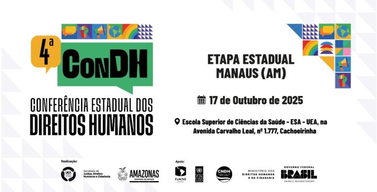 A Secretaria de Estado de Justiça, Direitos Humanos e Cidadania (Sejusc), em parceria com o Conselho Estadual de Direitos Humanos (CEDH), realiza, no dia 17 de outubro, a 4ª Conferência Estadual dos Direitos Humanos do Amazonas. O encontro acontecerá na Escola Superior de Ciências da Saúde, da Universidade do Estado do Amazonas (ESA/UEA), localizada no bairro Cachoeirinha, zona sul de Manaus.