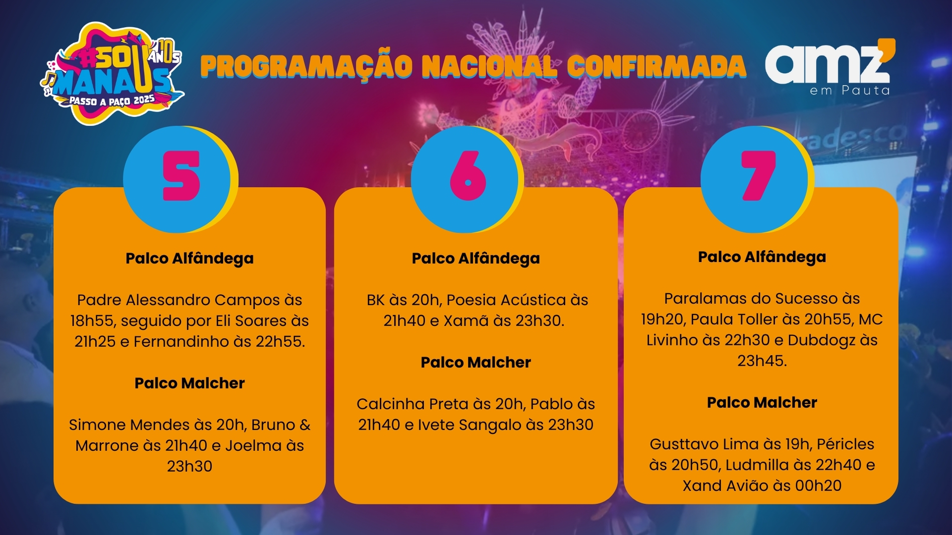 O festival "Sou Manaus Passo a Paço 2025" está confirmado para os dias 5, 6 e 7 de setembro, no Centro Histórico da capital amazonense. O evento reunirá mais de 20 atrações nacionais e cerca de 2 mil artistas regionais, além de manifestações culturais, gastronomia e moda indígena, prometendo ser a maior edição já realizada.