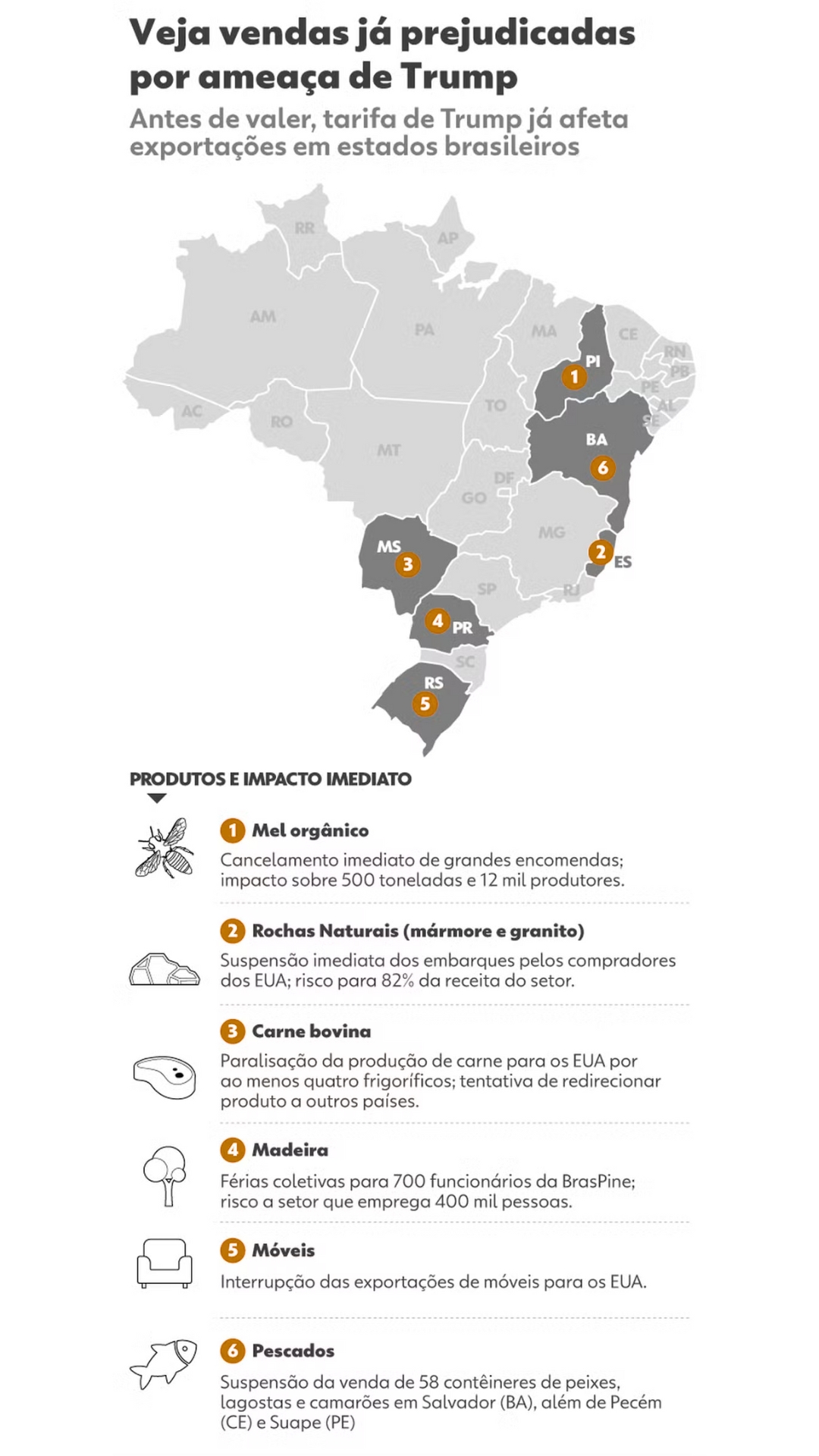 No Espírito Santo, potência na exportação de rochas naturais como granito e mármore, embarques foram suspensos por compradores norte-americanos. Embora os pedidos não tenham sido cancelados formalmente, empresas aguardam nova definição. O estado responde por 82% da receita nacional do setor.