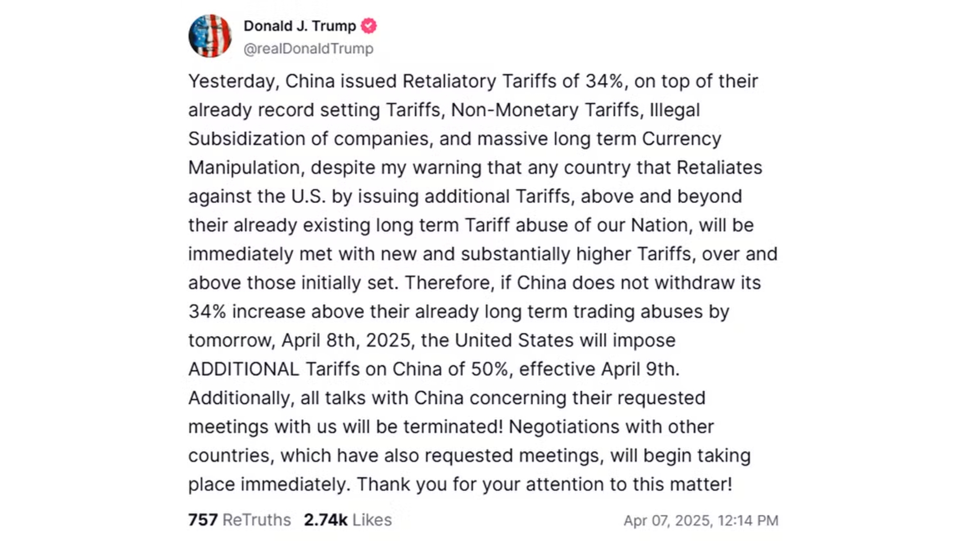 Trump também afirmou que todas as negociações com a China estão encerradas, mas que negociações com outros países, que também solicitaram reuniões, terão início imediato. O confronto comercial entre as duas maiores economias do mundo se intensificou no dia 2 de abril, quando os Estados Unidos impuseram uma tarifa de 34% sobre todos os produtos chineses.