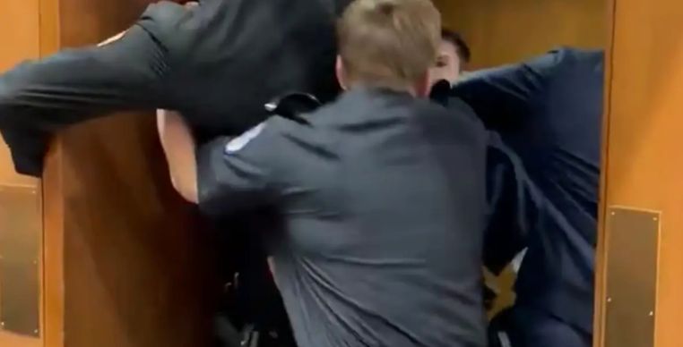 Imagens registradas no local mostram três policiais do Capitólio tentando retirá-lo da sala enquanto ele se agarra à porta para resistir. O senador Tim Sheehy também aparece auxiliando os agentes na tentativa de remover o manifestante do auditório.