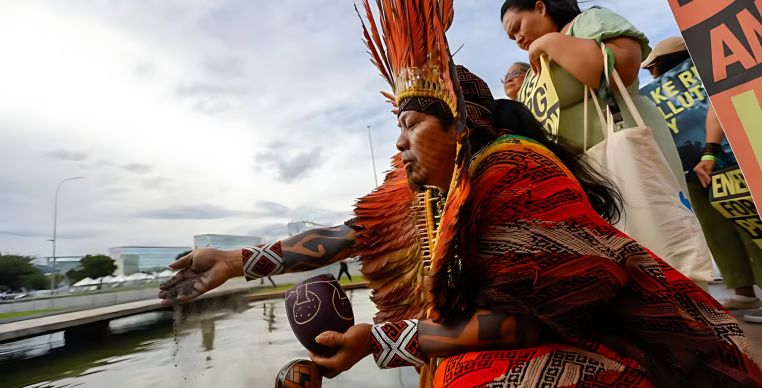 O cacique Ninawa, do povo Huni Kui, lançou cinzas amazônicas no espelho d’água do Palácio do Itamaraty como forma de protesto. Segundo ele, os povos indígenas não estão sendo ouvidos plenamente nas negociações climáticas: “Trouxemos essas cinzas como marca de resistência e denúncia”, afirmou.