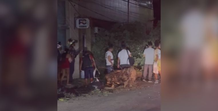 A tensão provocada pelo rompimento da fiação acabou atingindo uma árvore próxima, que não resistiu e foi arrancada pela raiz. A queda ocorreu em meio à movimentação de pedestres na região.